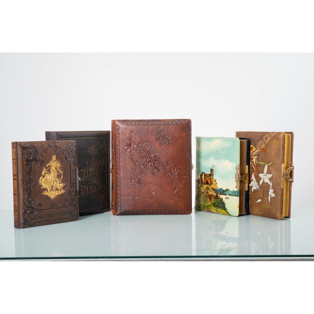 Cinque album portafotografie rivestiti in tessuto e cuoio.