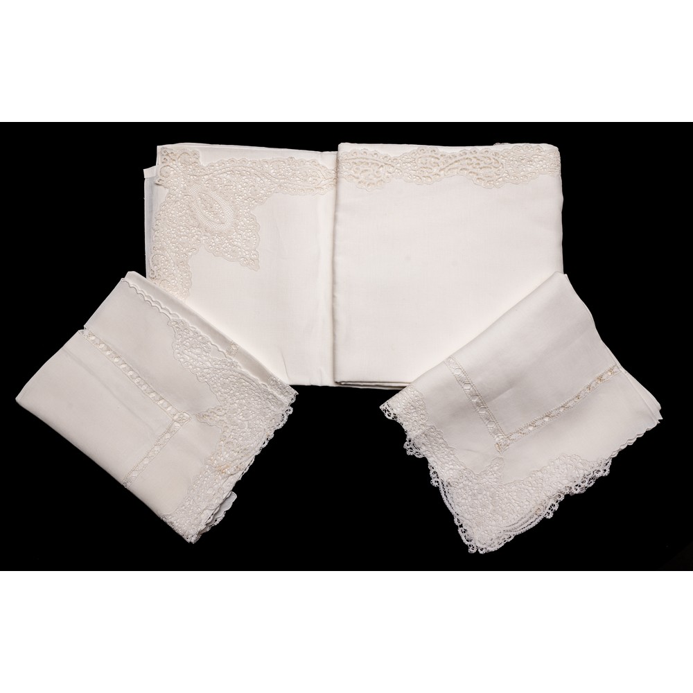 LENZUOLO matrimoniale in tessuto di lino nei toni del bianco con ricami a mano.