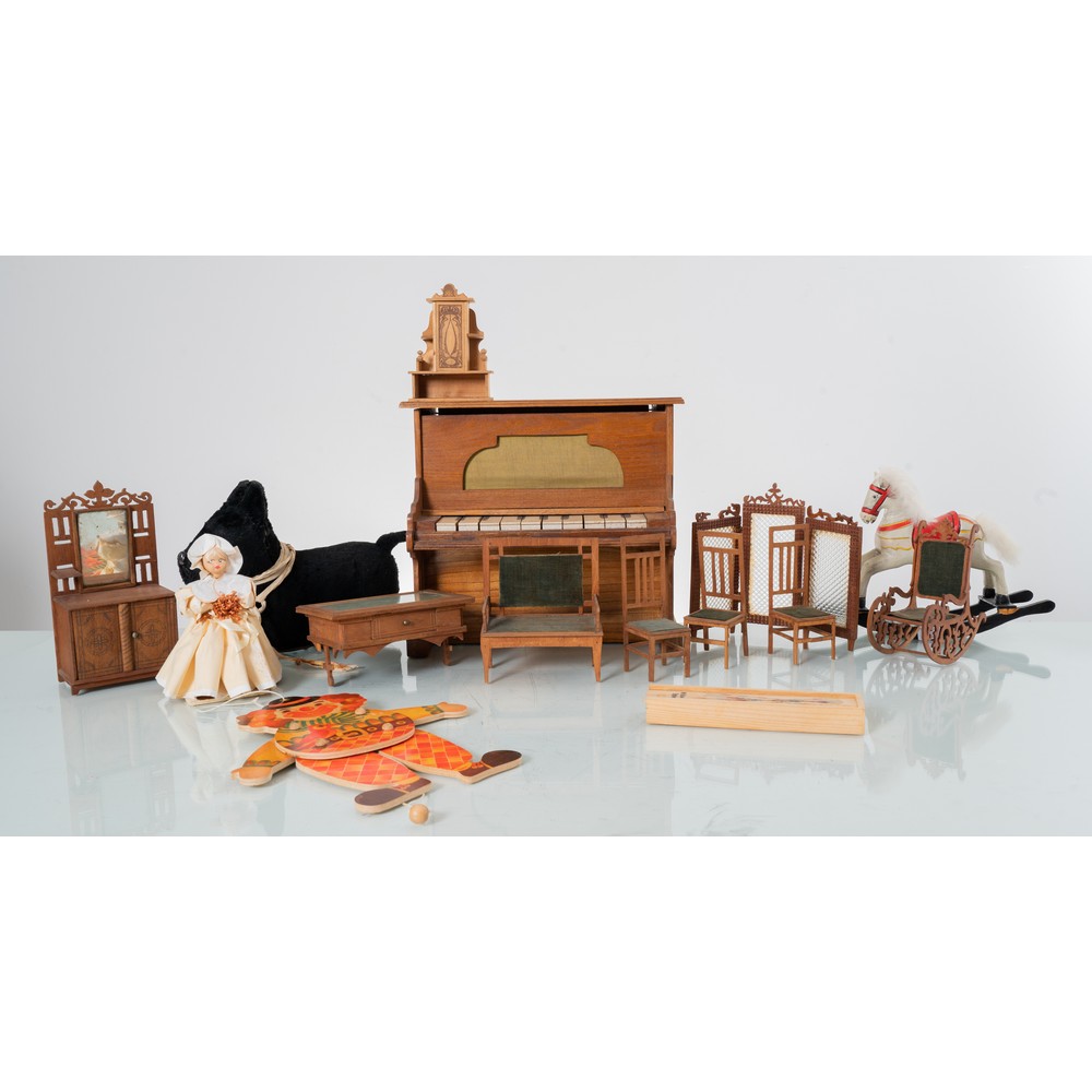 Quindici giocattoli composti da: dieci piccoli mobili, bambolina in cartapesta, cavallino a dondolo in miniatura, cagnolino automa, piccola scatola gioco Mikado e clown in legno a molla (usure e difetti).