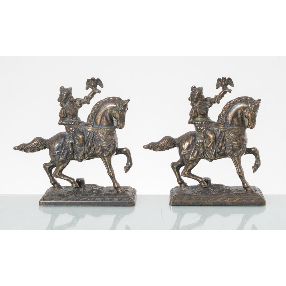 Coppia di sculture in metallo brunito raffiguranti "Figure e cavallo".