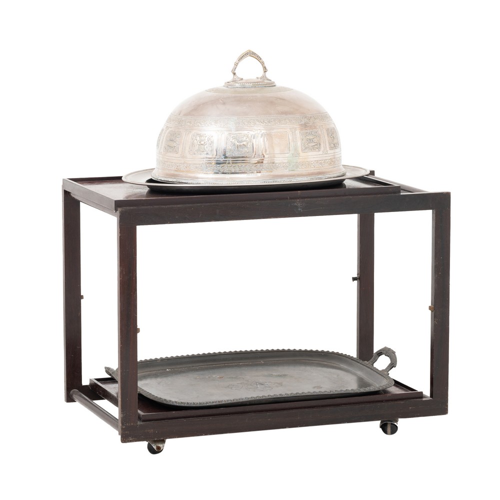 CARRELLO a due ripiani in legno di mogano, vassoio con manici e coprivivande con piatto da portata.