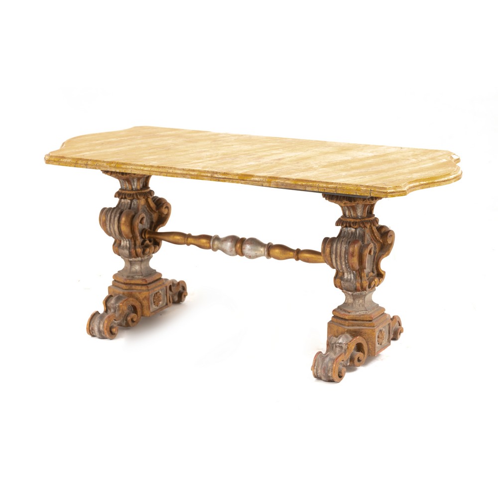 TAVOLINO da salotto in legno laccato e argentato, piano in legno laccato a finto marmo.