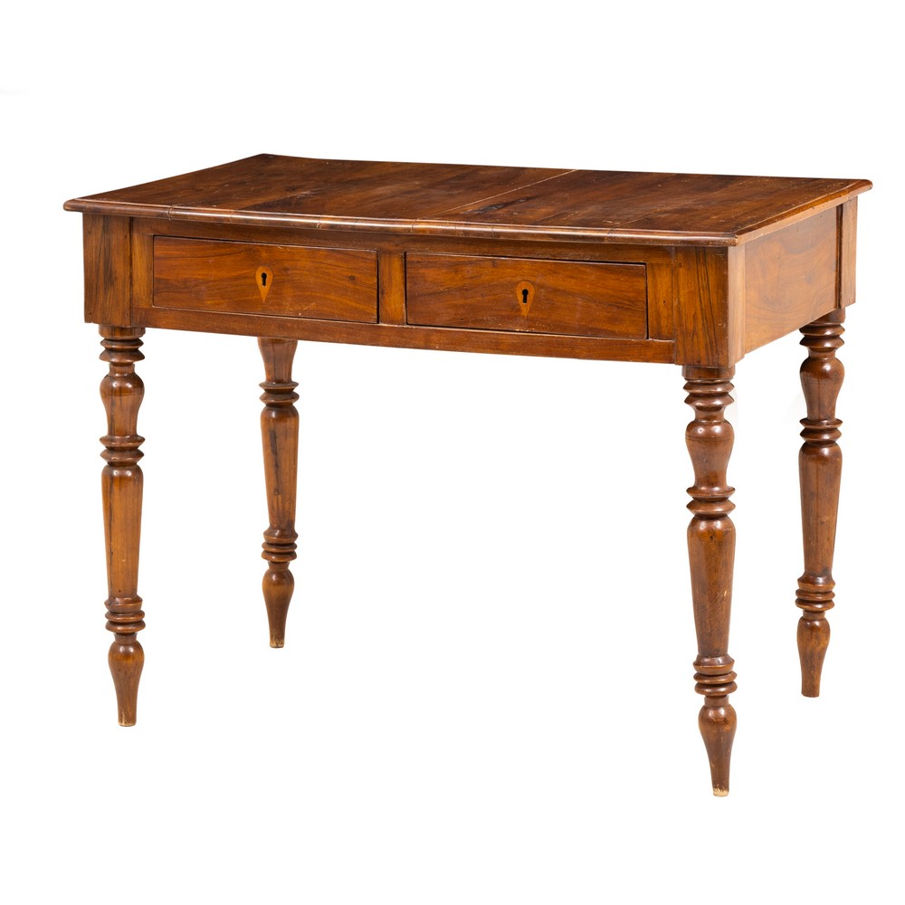 Tavolo/scrittoio a due cassetti in legno di noce.