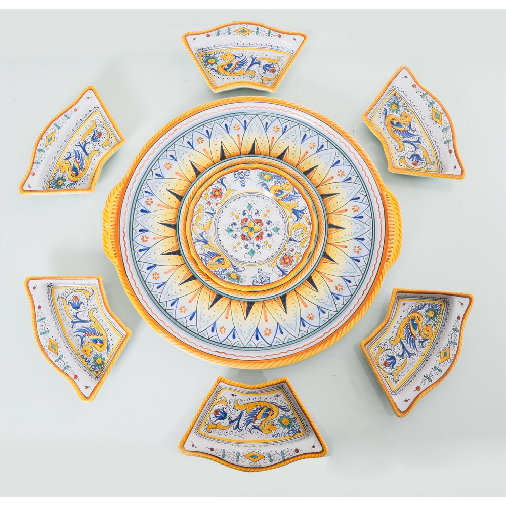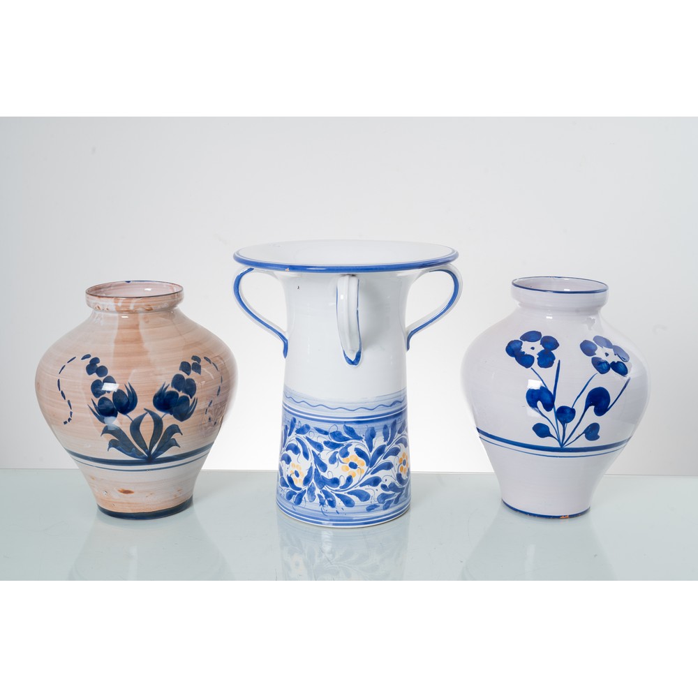 DUE VASI, CILINDRO E ANTIPASTIERA in ceramica decorata.