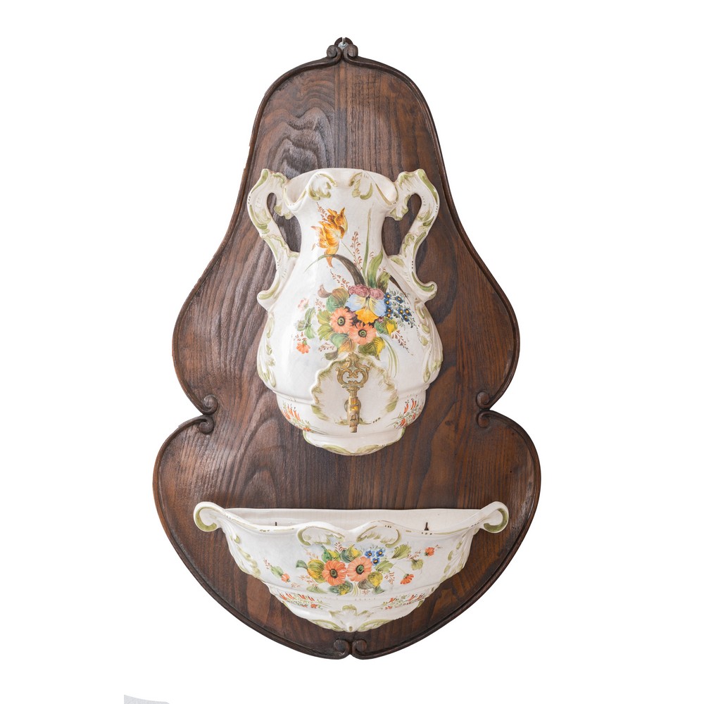 FONTANELLA da muro in ceramica smaltata e decorata (restauri e usure).