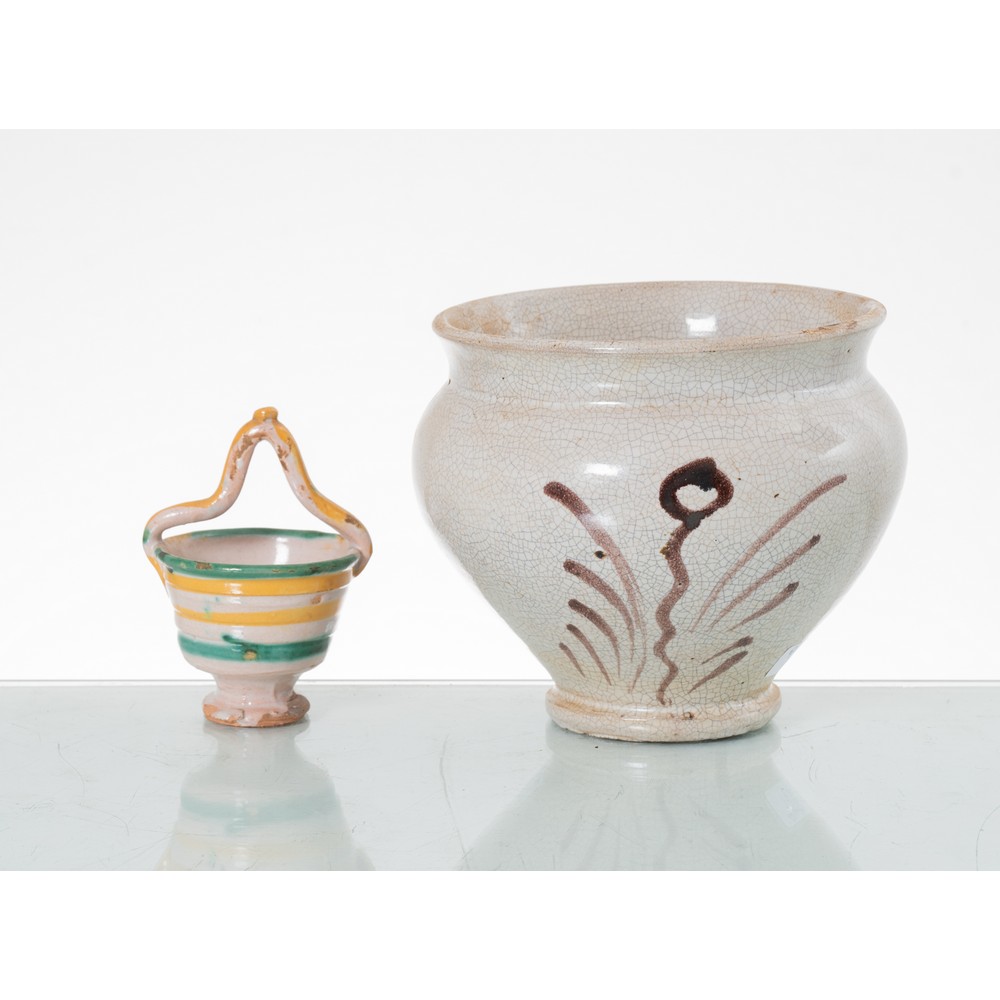 Vaso e piccolo cestino in ceramica smaltata e decorata (usure).
