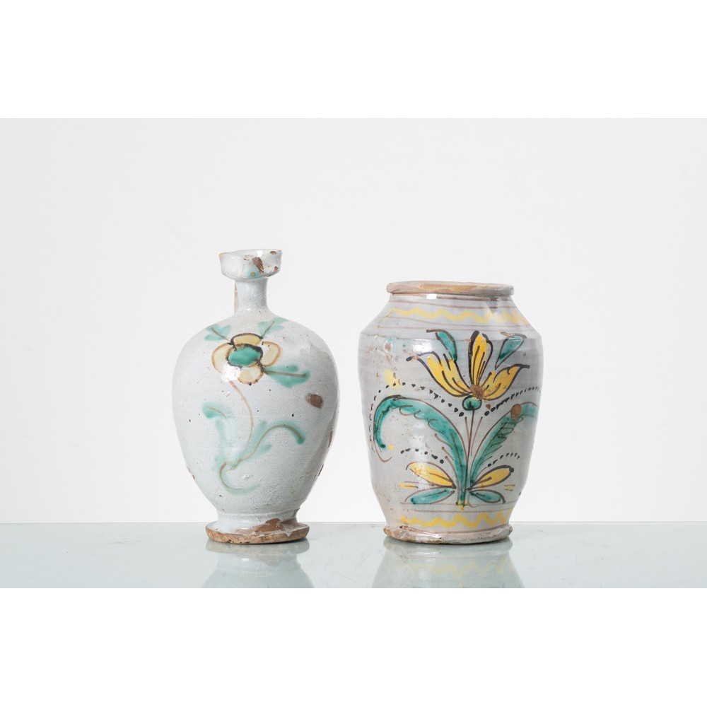 Oliera e cilindro in ceramica smaltata e decorata (usure).
