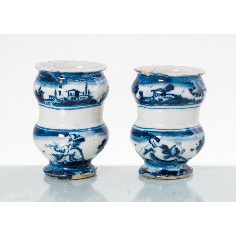 Coppia di albarelli in ceramica smaltata e decorata raffigurante "Paesaggio con figura mitologica" (usure e difetti).
