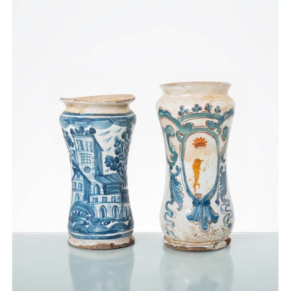 Due albarelli in ceramica smaltata e decorata raffiguranti "Paesaggio con castello" e "Stemma nobiliare" (mancanze).