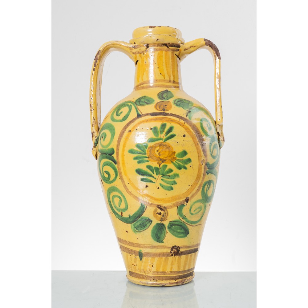 Anfora in ceramica smaltata e decorata datata 1947 (usure e mancanze).