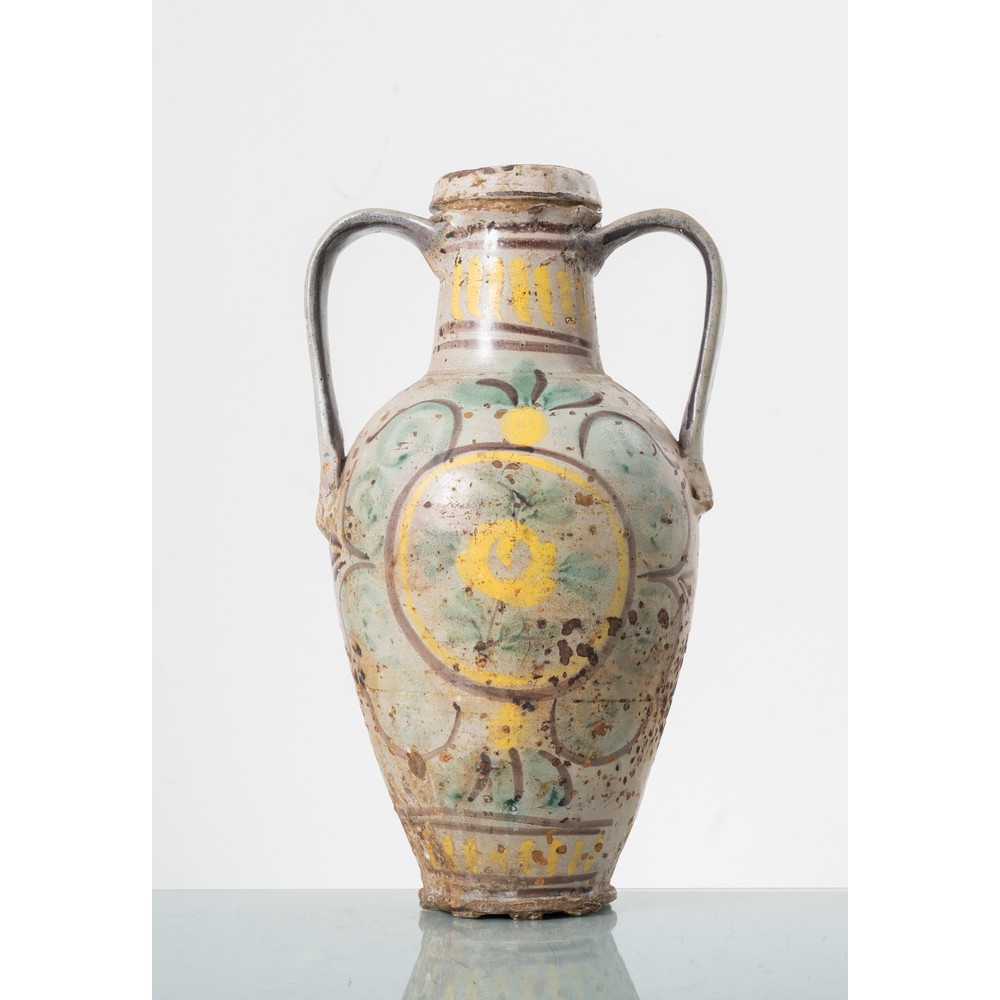 Anfora in ceramica smaltata e decorata datata 1903 (restauri).