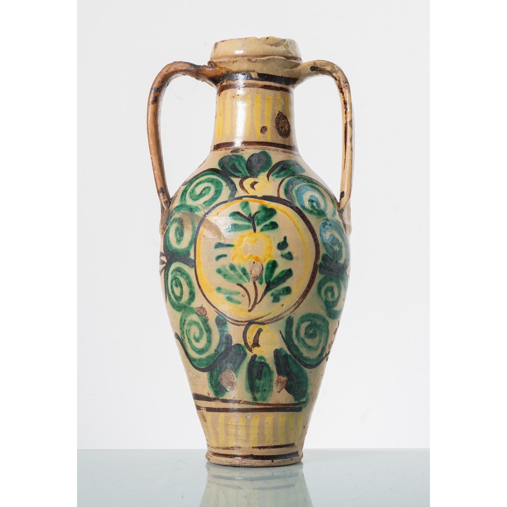 Anfora in ceramica smaltata e decorata datata 1947 (restauri e usure).