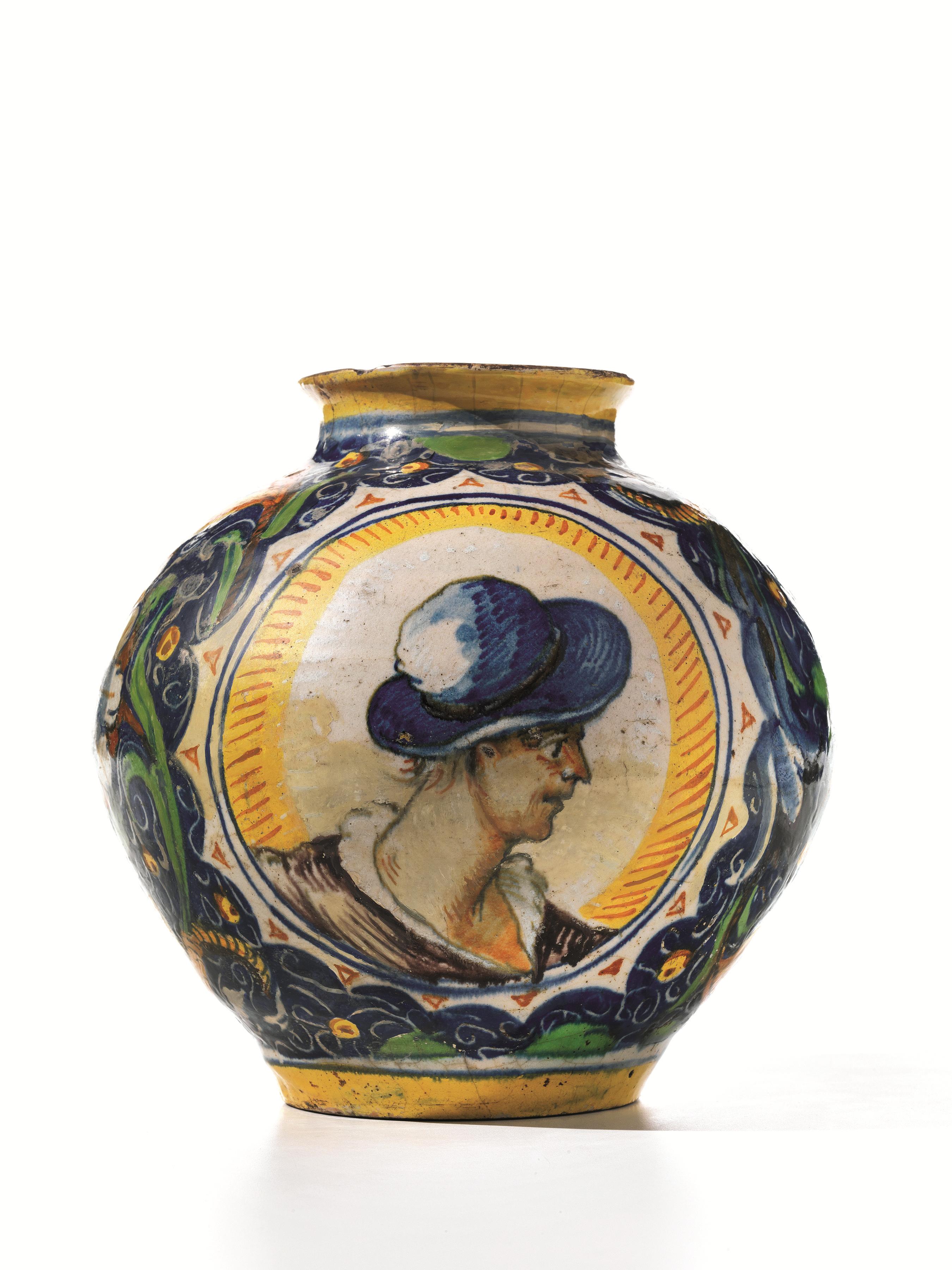 Questa tipologia di vasi costituisce una delle produzioni più ricercate della bottega veneziana dalla metà del XVI secolo, e comprende esemplari di qualità e decorazioni varie, con figure di Santi dipinte a figura intera, ritratti barbati di vecchi, ritratti di giovinetti, turchi con turbanti, guerrieri con elmo, fanciulle o donne variamente atteggiati e inseriti in cornici più o meno elaborate. La qualità della pittura e della materia e il confronto con altri esemplari ci fanno pensare comunque alla produzione più antica della bottega veneziana.