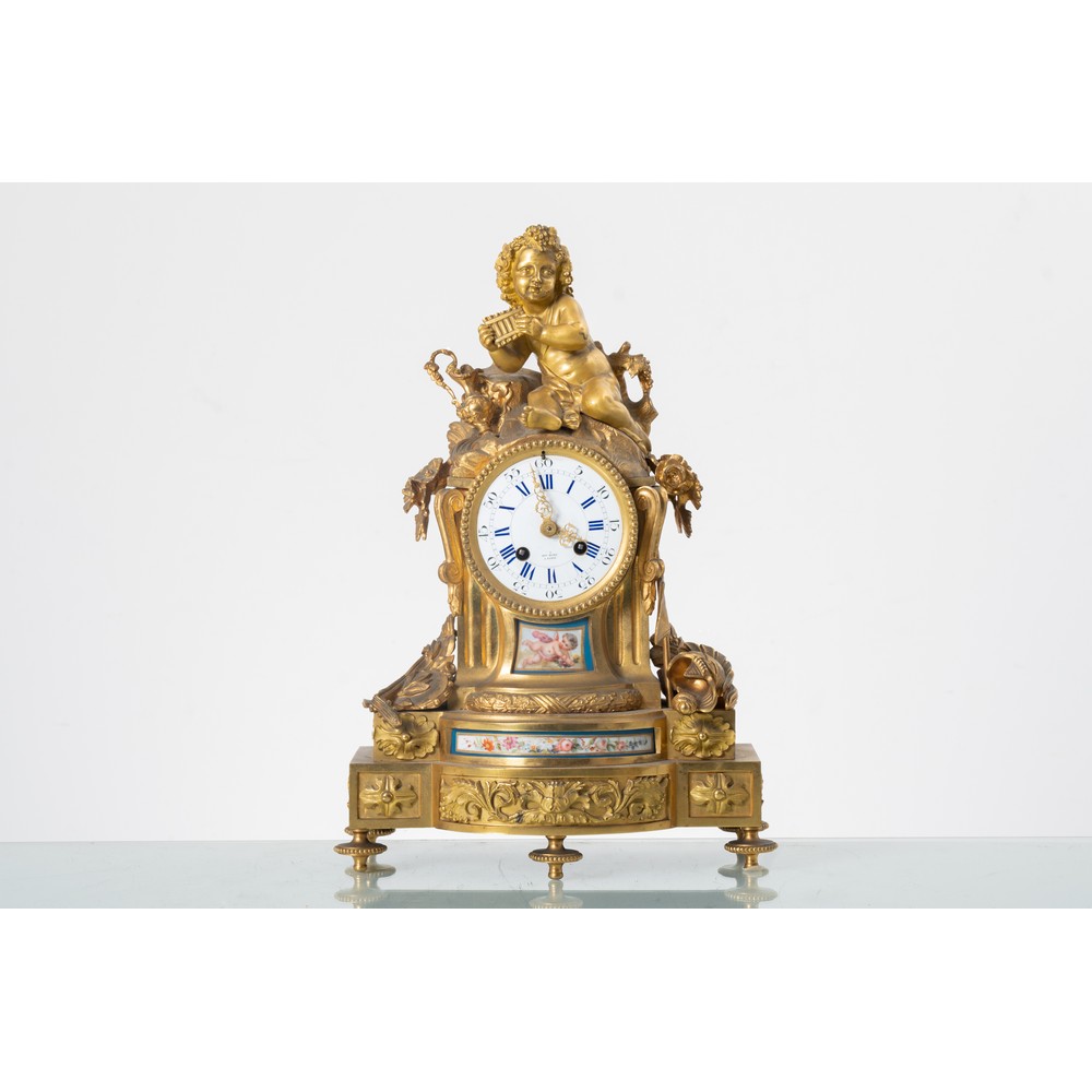 Orologio in bronzo dorato a mercurio raffigurante "Allegoria di putto musicante" con placche in porcellana di Sevres dipinte a mano.