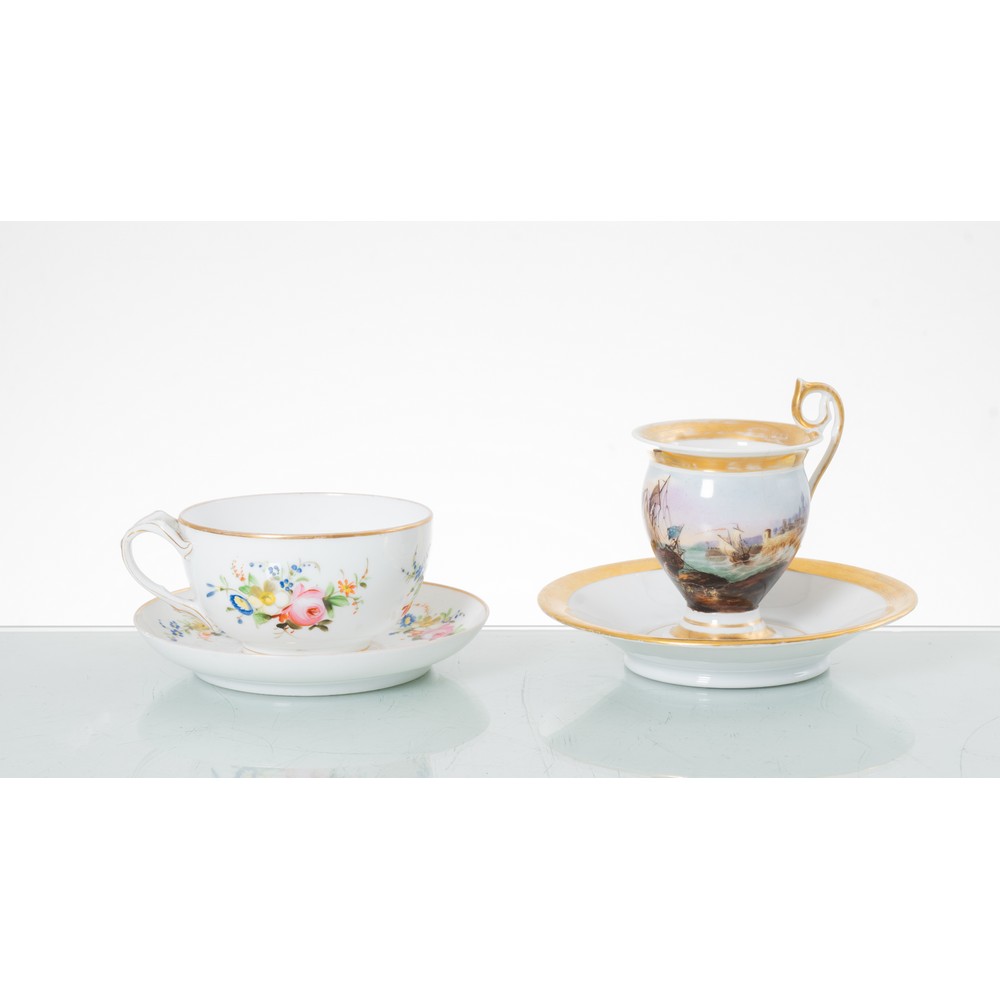 Tazza Impero decorata a mano raffigurante "Paesaggio costiero con galeone in tempesta" e tazza in porcellana decorata a motivo floreale (difetti).