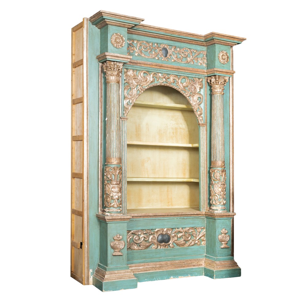 Libreria a giorno realizzata con elementi del XVIII secolo in legno dorato ad argento a mecca.