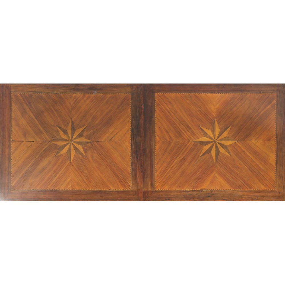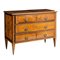 Cassettone Luigi XVI a tre cassetti in legni di rosa, noce e tarsie in bosso.