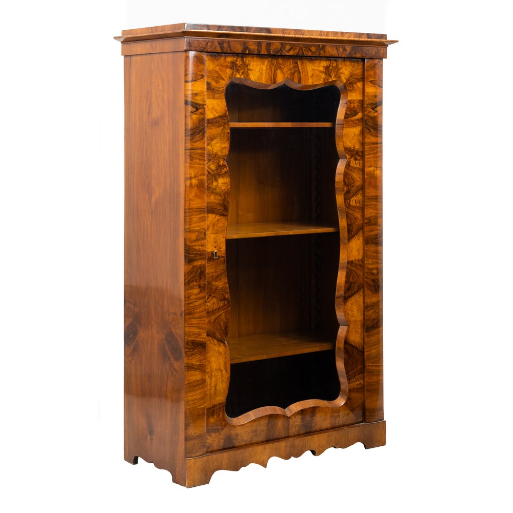 Vetrina ad un'anta lastronata in legno di noce e radica di noce.
