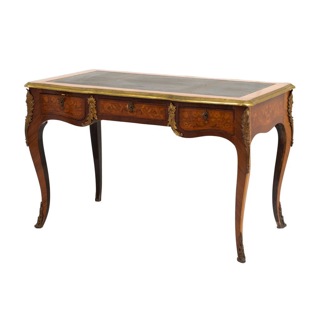 Scrittoio stile Luigi XV con tre cassetti in bois de rose e legni in varie essenze di frutto, guarniture in bronzo dorato.