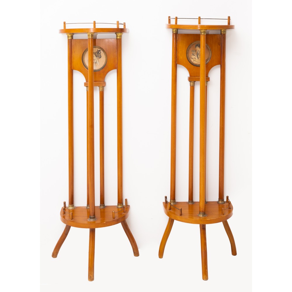 Coppia di cantoni in legno di mogano con basi e capitelli in metallo (usure e mancanze).