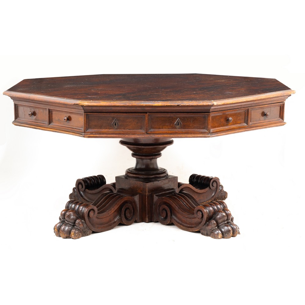 Grande tavolo di forma ottagonale in legno di noce con sedici piccoli cassetti.