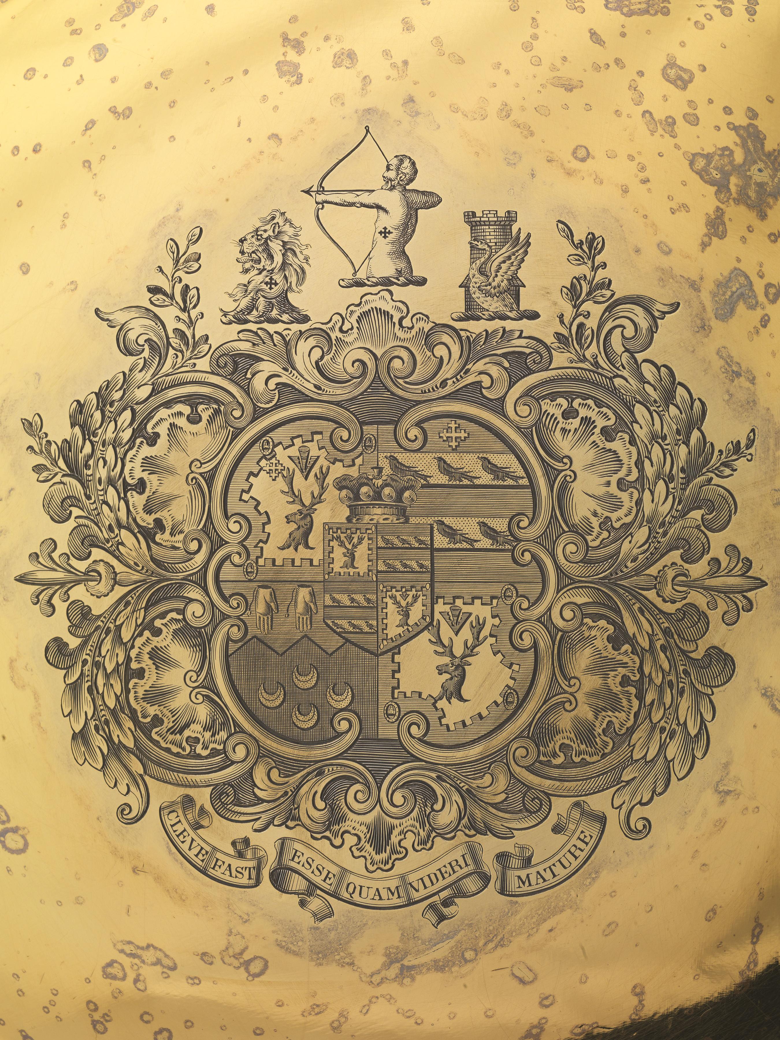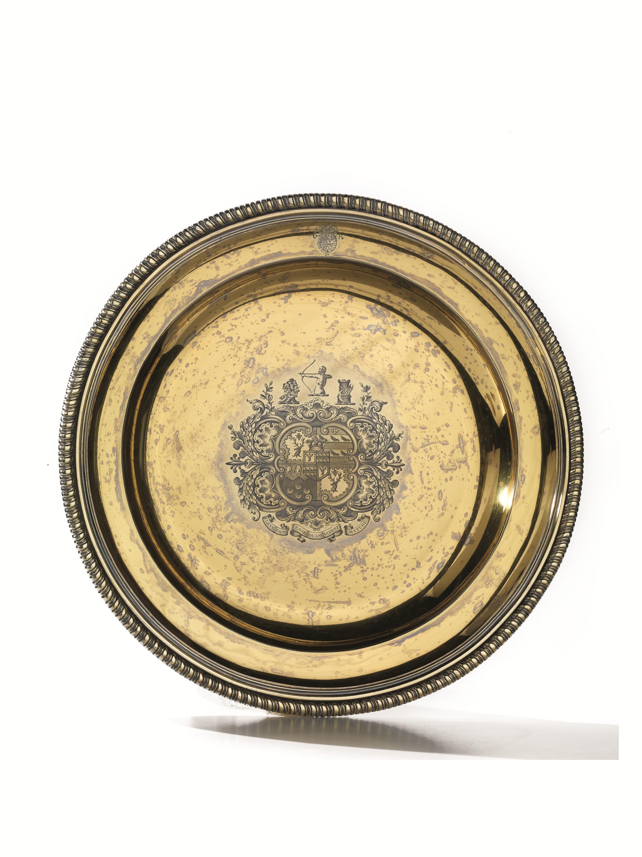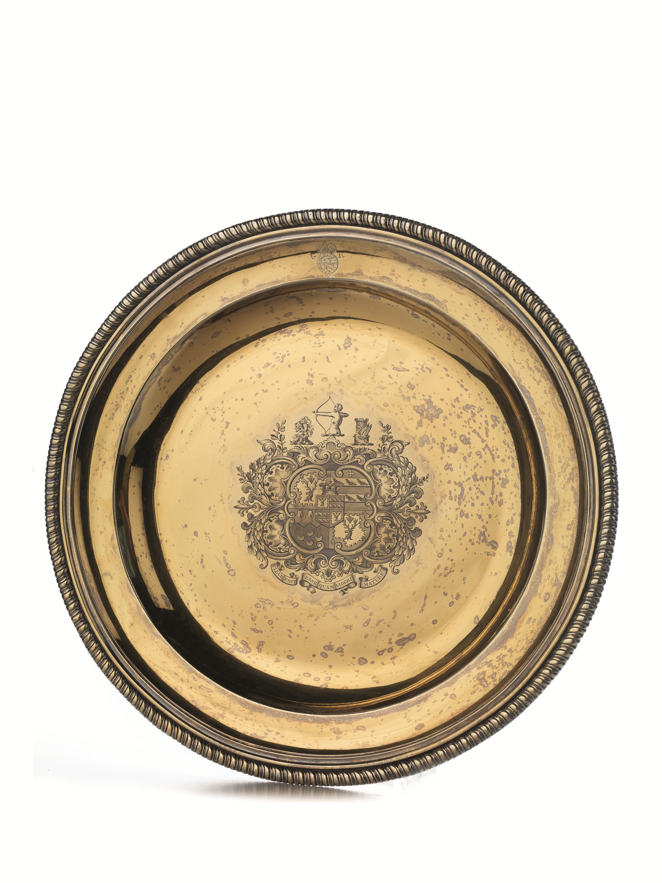 piano in argento vermeil con stemma e motto CLEVE FAST ESSE QUAM VIDERI MATURI incisi entro corona di foglie, diam. cm 48, complessivi g 6700 (2)