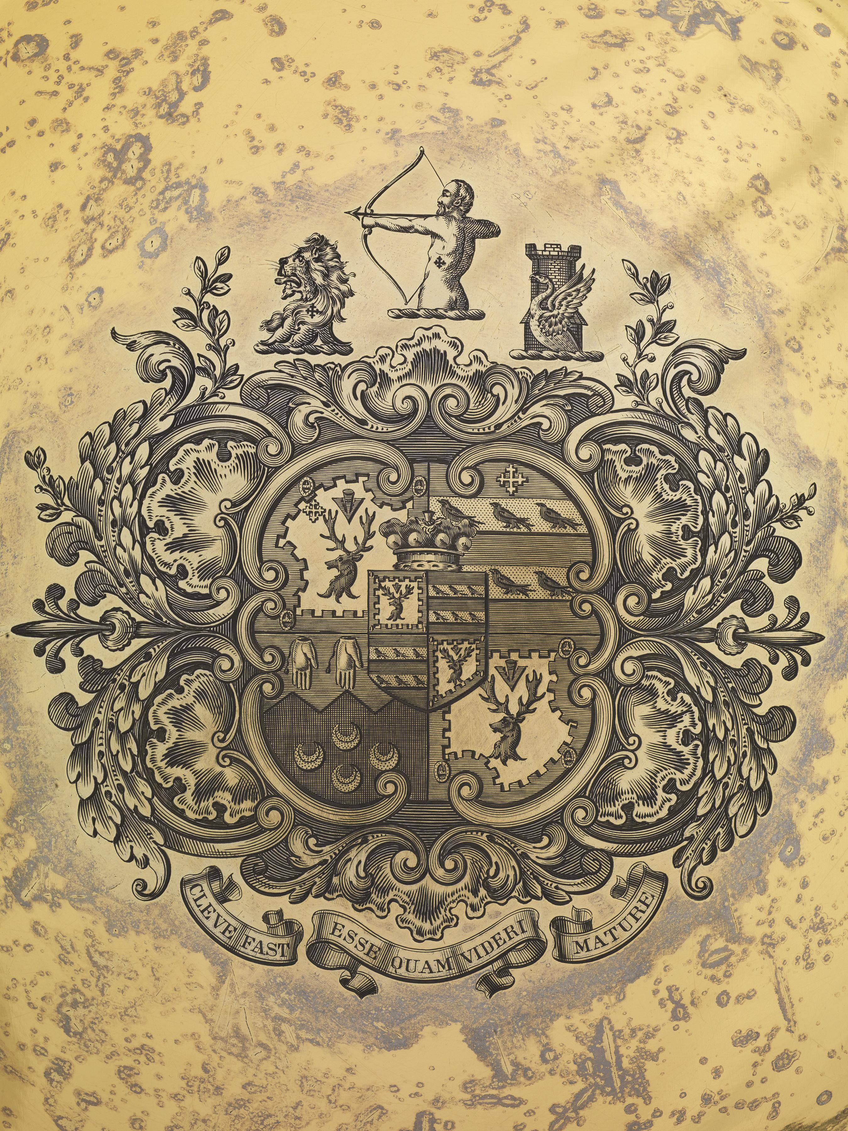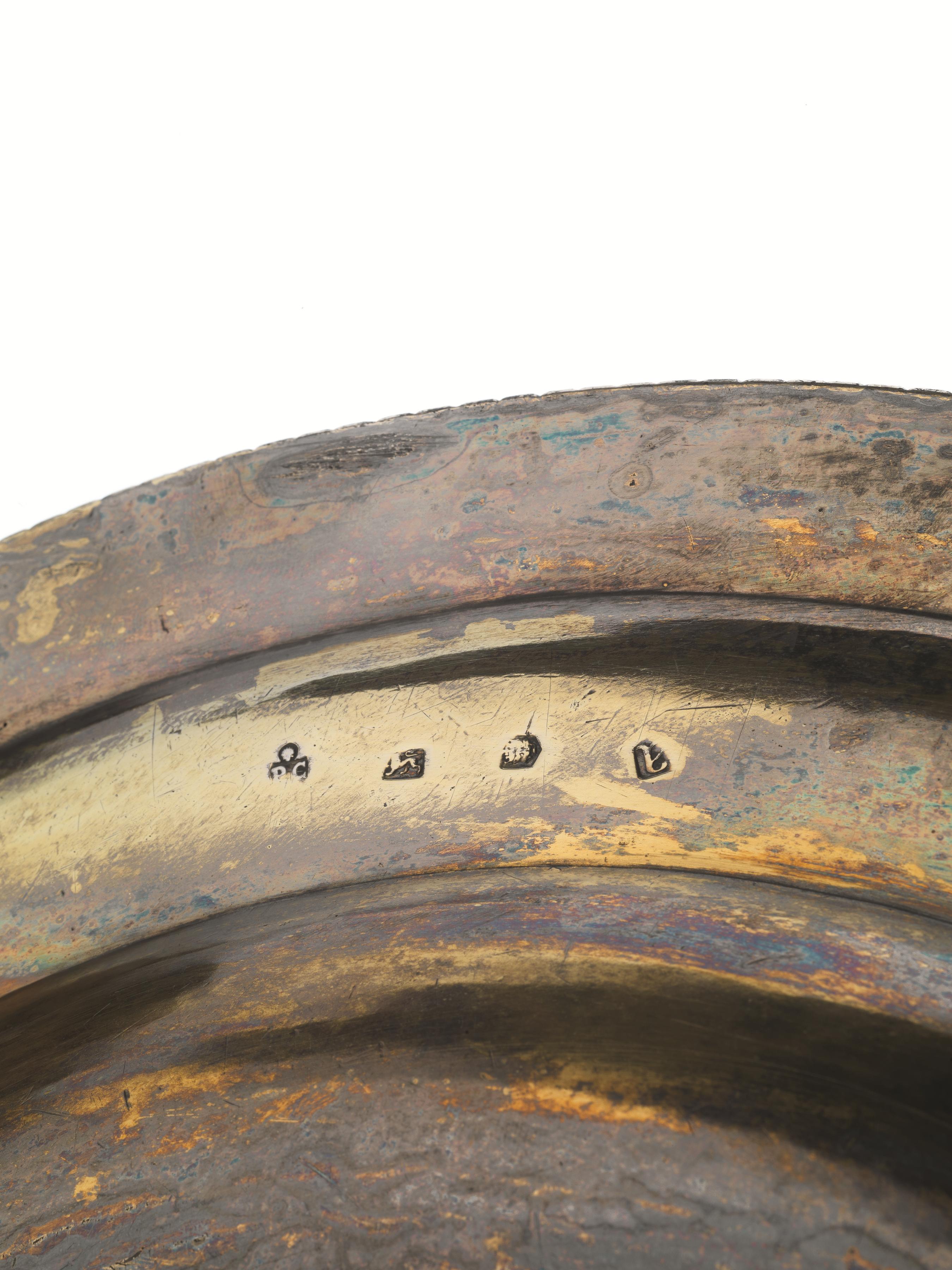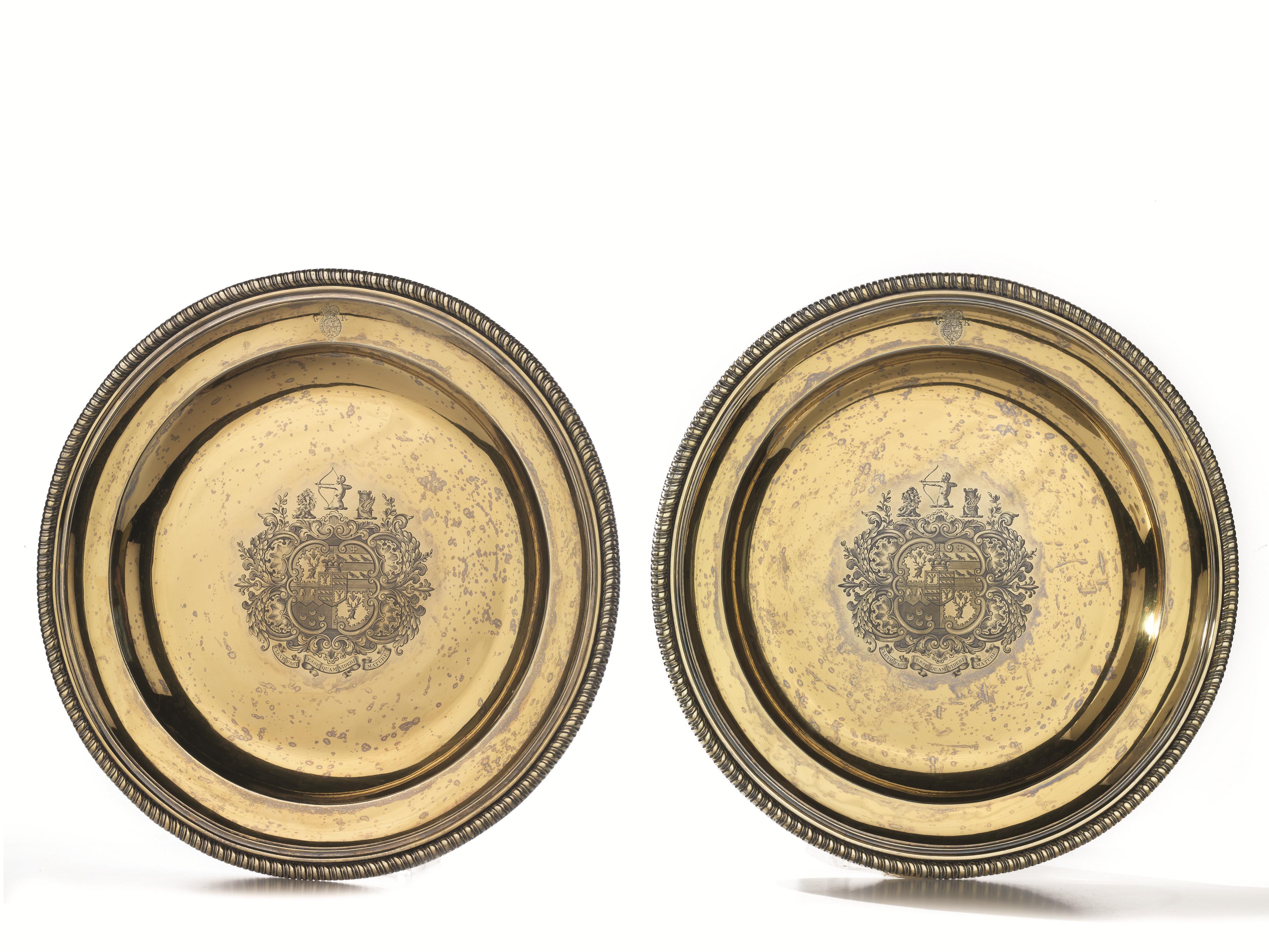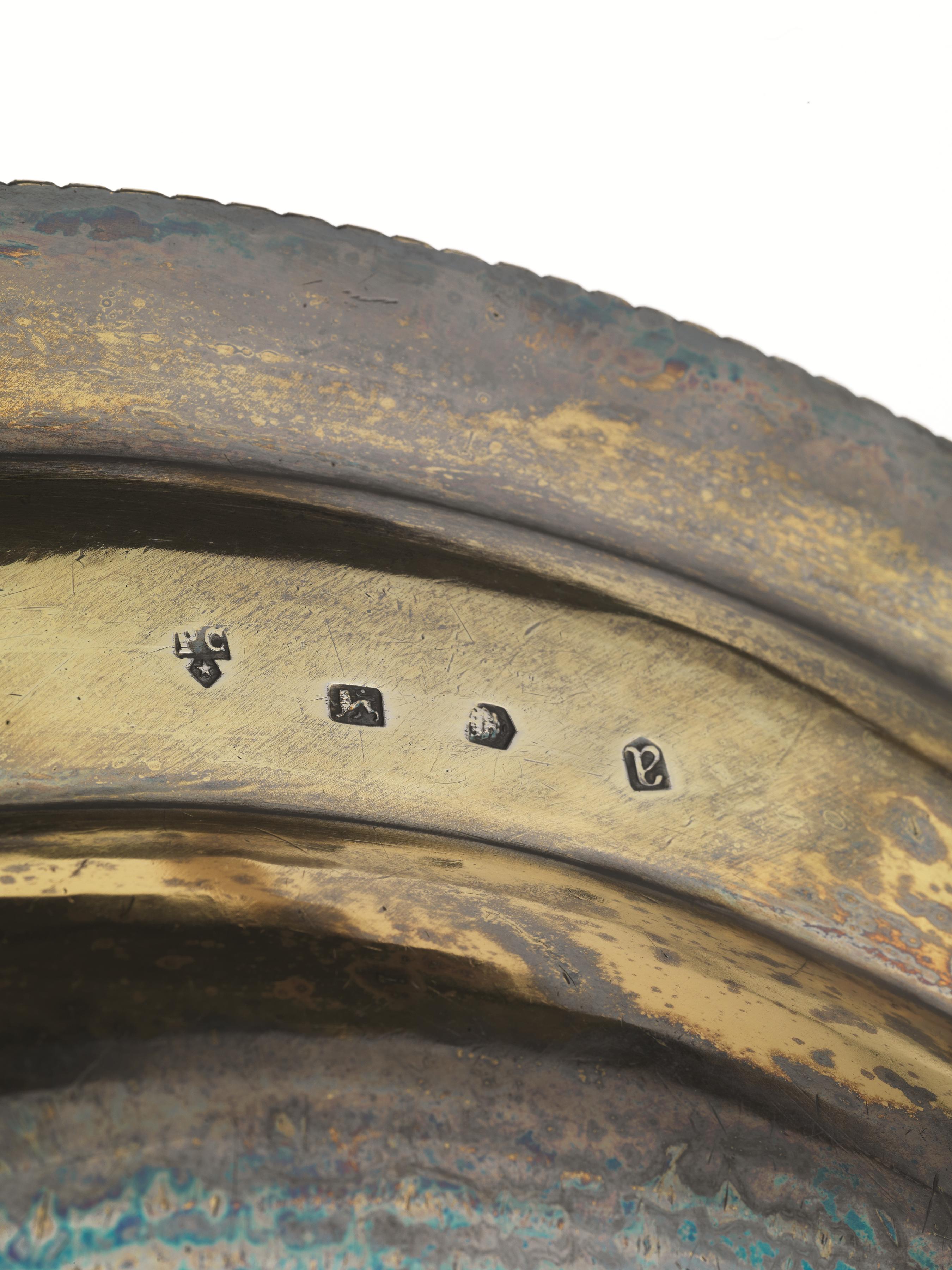 piano in argento vermeil con stemma e motto CLEVE FAST ESSE QUAM VIDERI MATURI incisi entro corona di foglie, diam. cm 48, complessivi g 6700 (2)