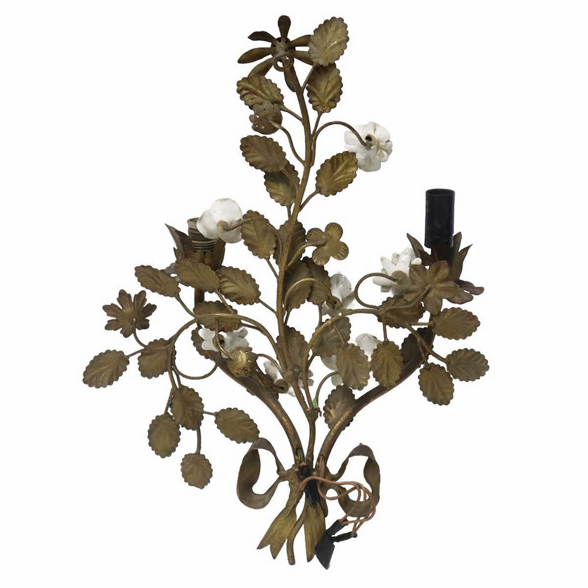 Capodimonte - Applique a 2 luci metallo dorato con applicazioni di fiori in porcellana di Capodimonte, Primi 20° secolo
