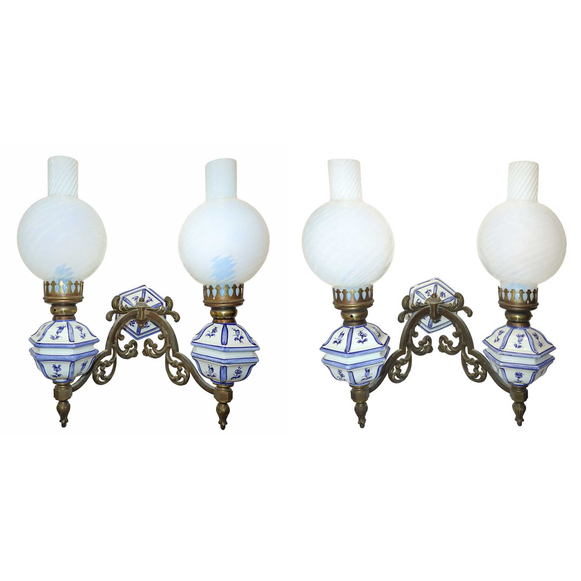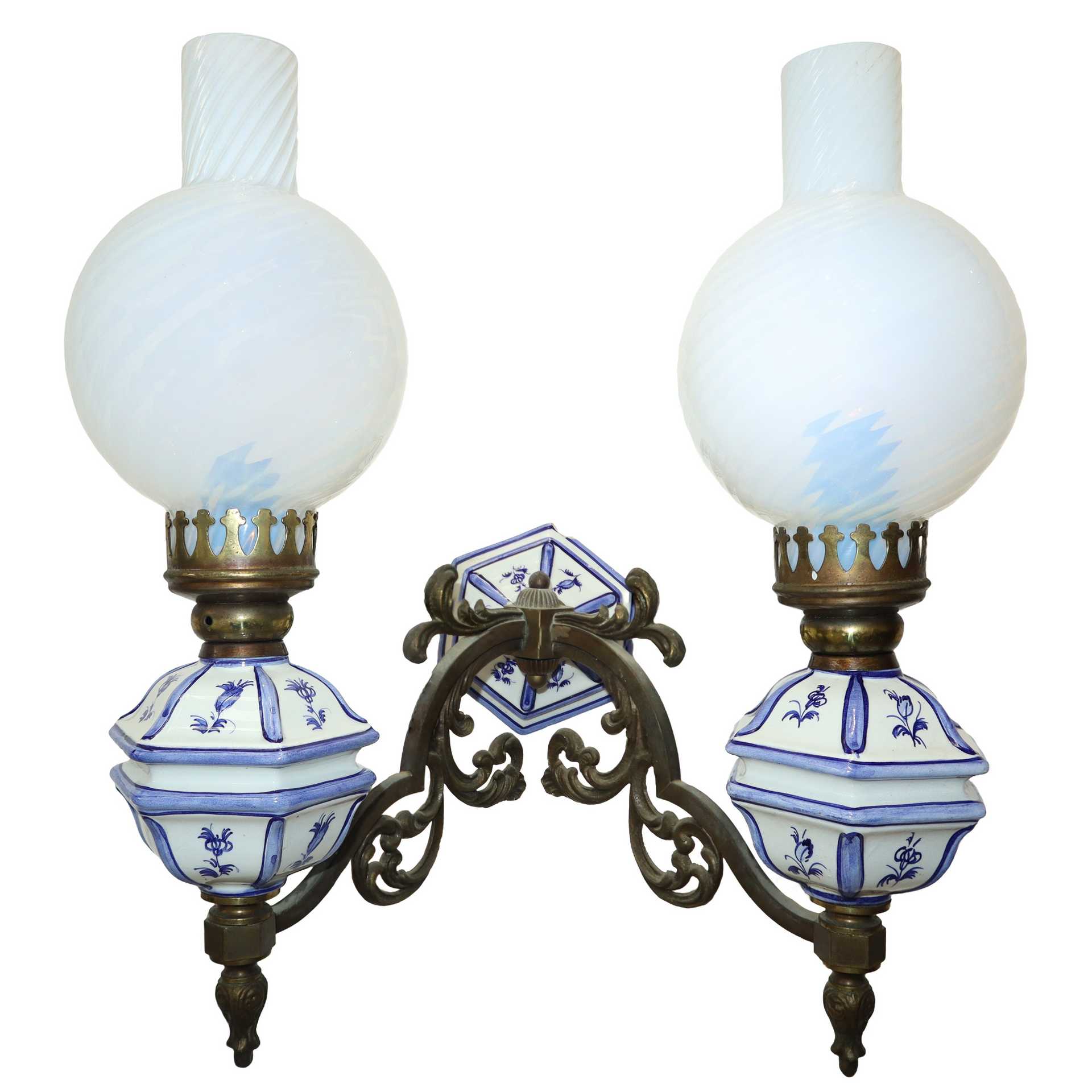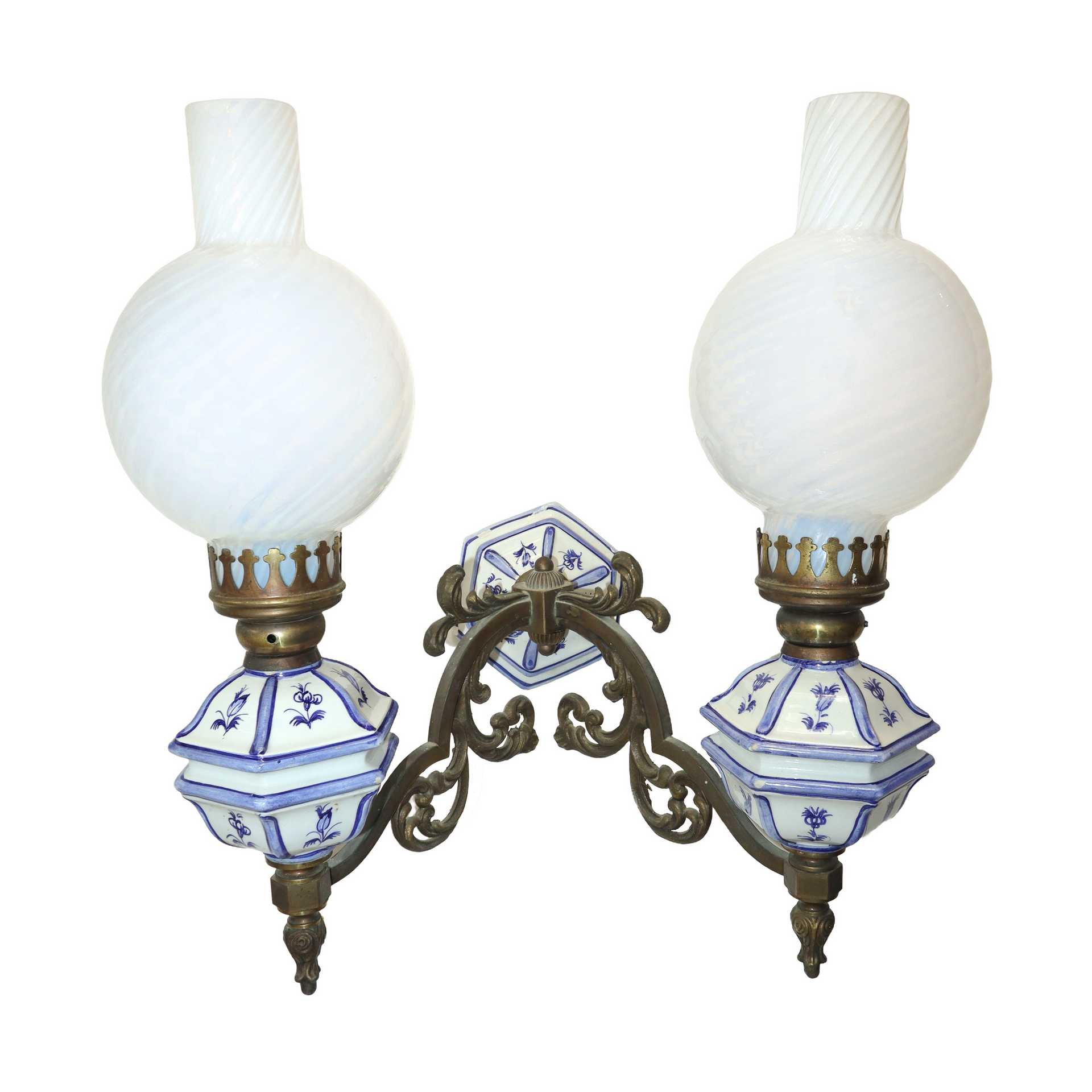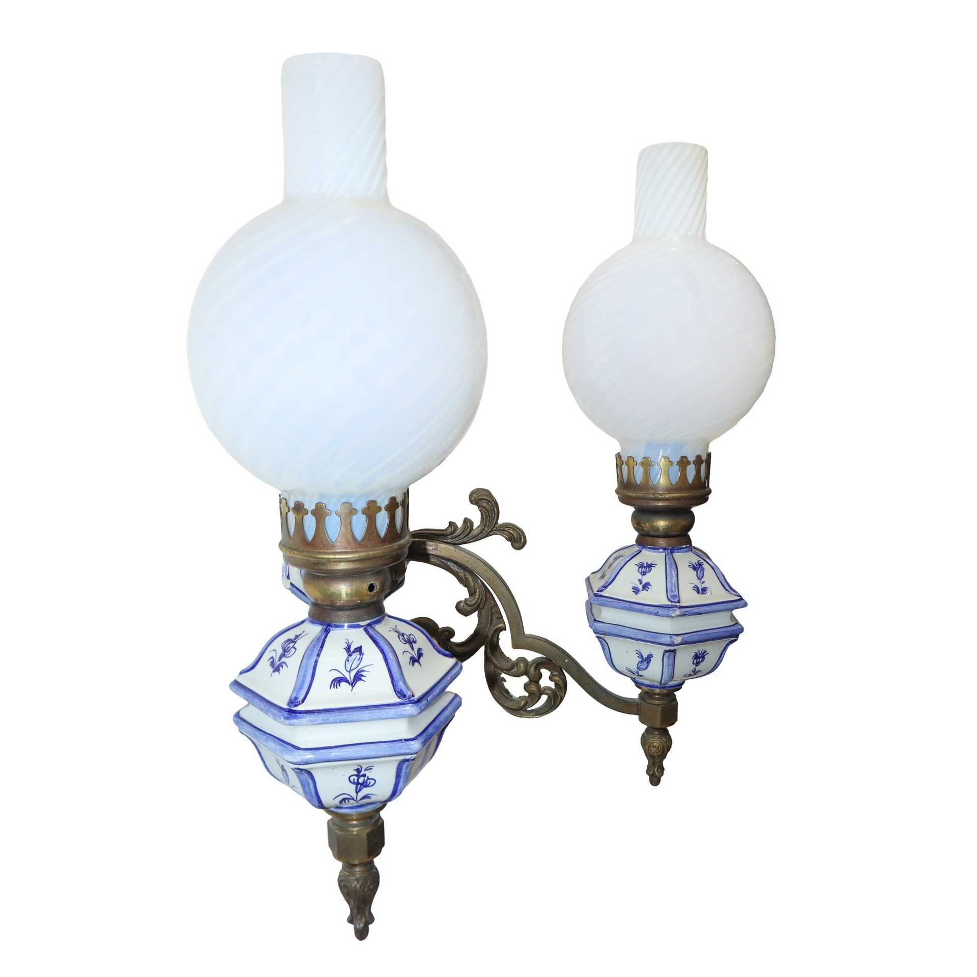 Coppia di applique a due luci in maiolica bianca e blu, Primi 20° secolo Decorazione con soggetti floreali base in metallo dorato, originariamente a petrolio, elettrificate, diffusore in vetro sferico opalescente.