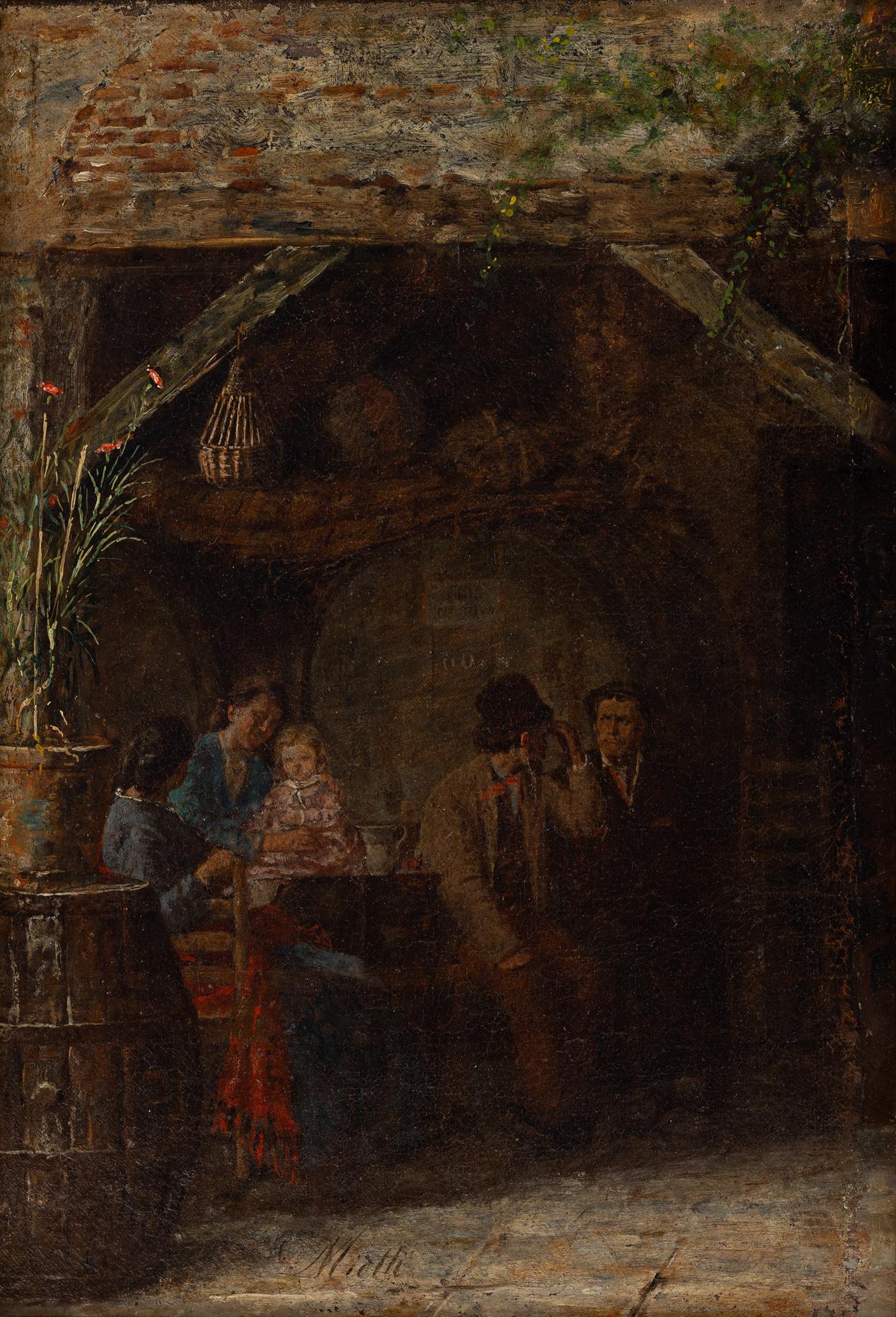 Domenico Miotti - Scena familiare in interno - Treviso 1838 - Venezia 1916 - Olio su tela cm 48,5x33