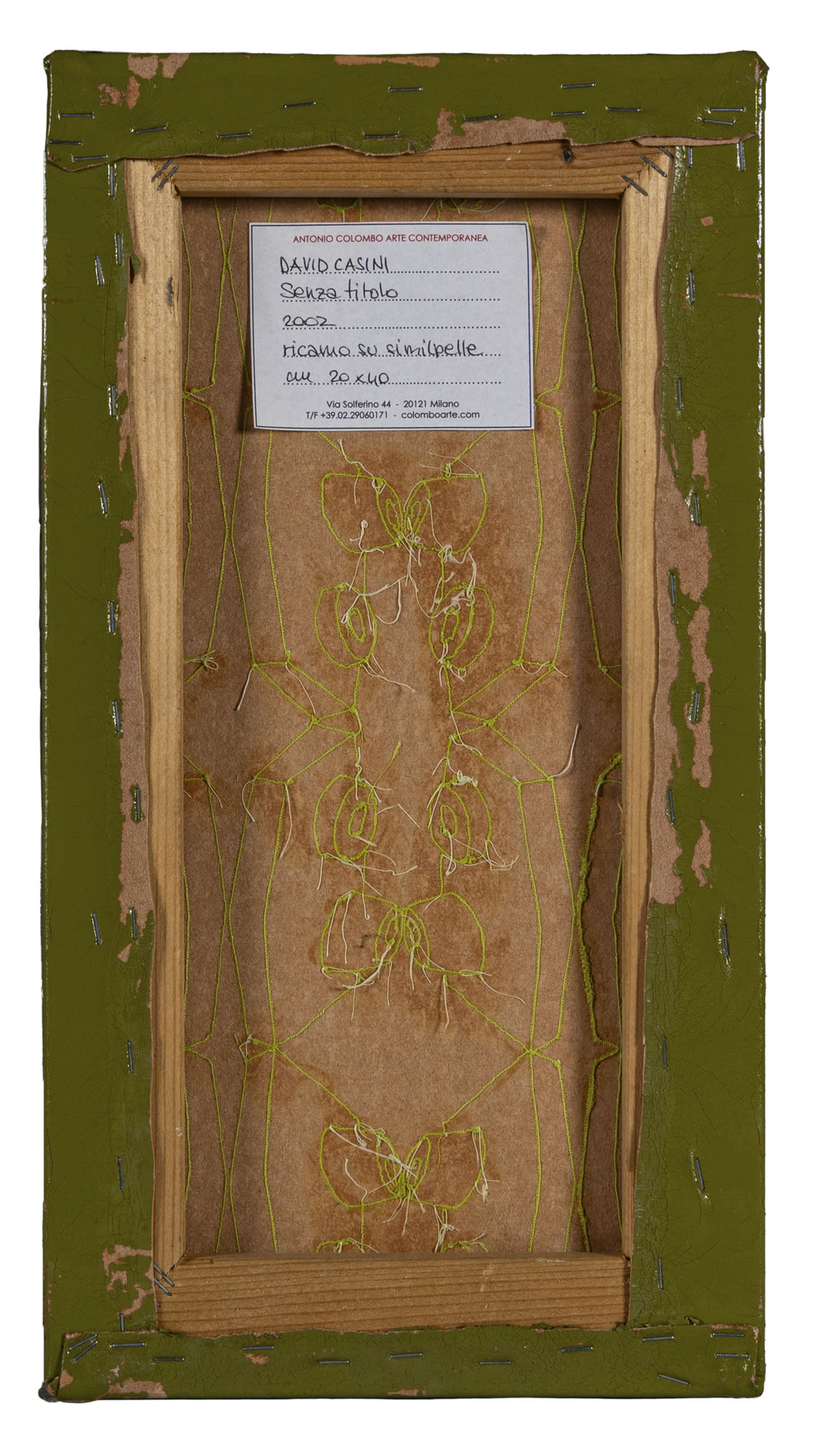 DAVID CASINI(1973)Senza titolo2002Ricamo su similpelle42,5 x 23 cmData e titolo su etichetta al retroOpera accompagnata da autentica a cura della Antonio Colombo Arte Contemporanea, MilanoPROVENIENZA:Antonio Colombo Arte Contemporanea, MilanoCollezione privata, Milano