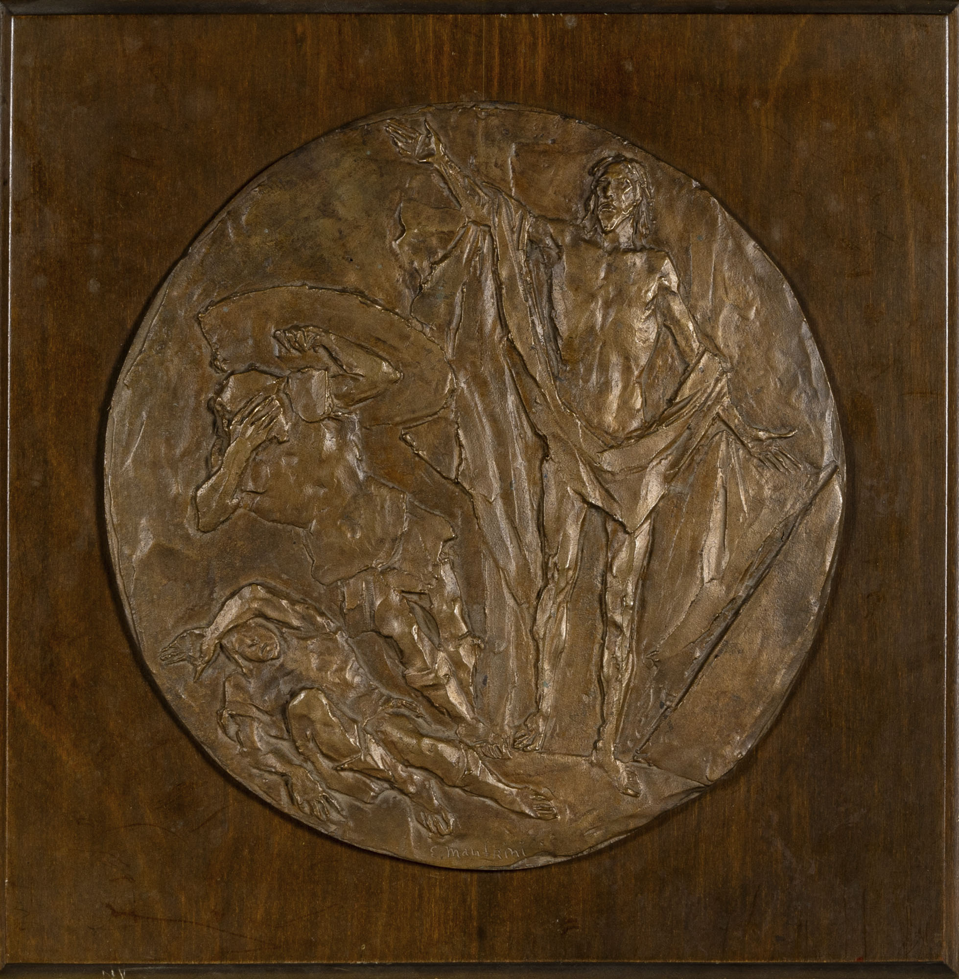 ENRICO MANFRINI(1917 - 2004)Senza titoloBassorilievo in bronzo applicato su tavolaDiametro: 27 cmDimensioni complessive: 36,5 x 36,5 cmFirma incisa in basso al centroPROVENIENZA:Collezione privata, Milano