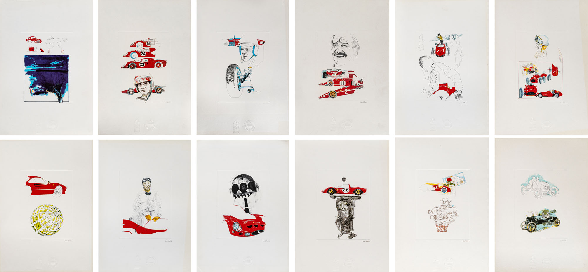 NANI TEDESCHI(1938 - 2017)Senza titolo (Ferrari)1995Lotto di 12 acqueforti e acquetinte, es. non numerati, Edizioni d'Arte Fioranese, Galleria Ferrari, Maranello (timbri a secco)Ogni opera misura:49 x 34 cm (foglio)25,5 x 19 cm (lastra)Ogni opera è firmata a matita in basso a destraPROVENIENZA:Collezione privata, Milano