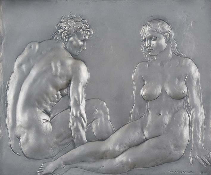 MESSINA FRANCESCO Linguaglossa 1900 - Milano 1995 Figure multiplo su lastra di argento 17,5x21 cm firma in basso a destra