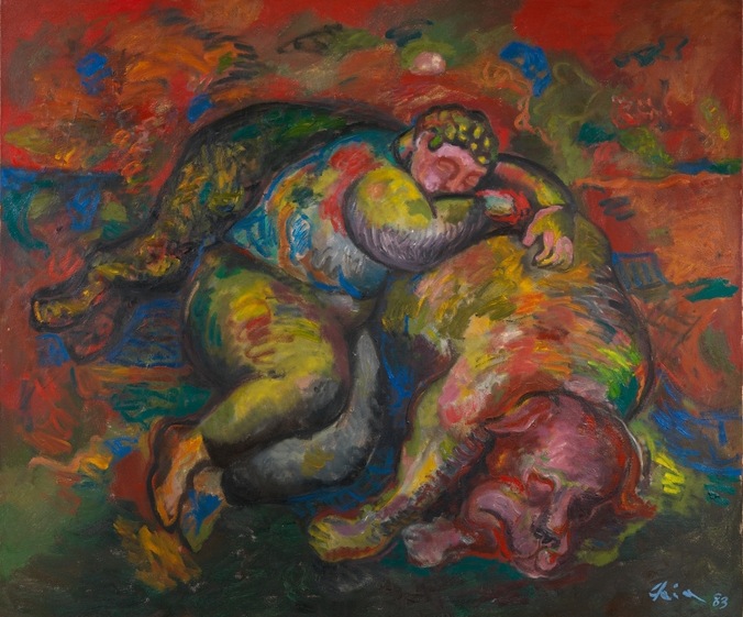 Sandro Chia (Firenze 1946) BOY AND DOG SLEEPING olio su tela, cm 200x235 firmato e datato eseguito nel 1983 L’opera è accompagnata da autentica dall’artista su fotografia Provenienza Richard Grey Gallery, Chicago Sperone Westwater Fischer, New York