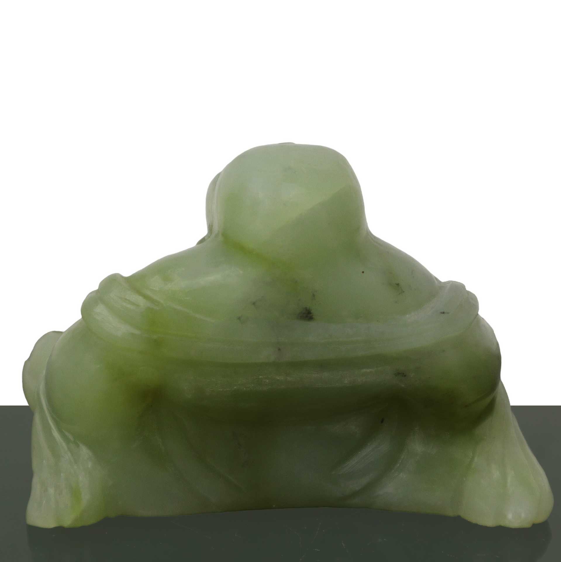 Buddha in giada verde chiaro H cm 8x11,5 Incavo nell'oggetto tenuto nella mano sinistra, forse mancanza di un oggetto.Incavo nell'oggetto tenuto nella mano sinistra, forse mancanza di un oggetto.