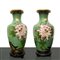 Coppia di vasi cinesi cloisonne a sfondo verde acqua con fiori rosa e giallo, decori dorati