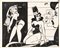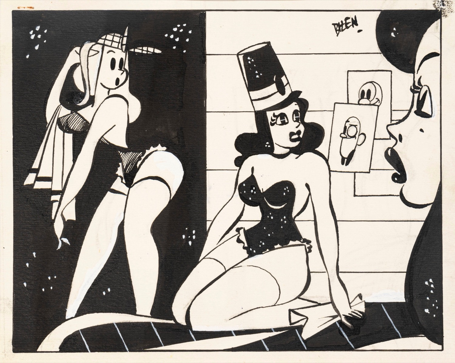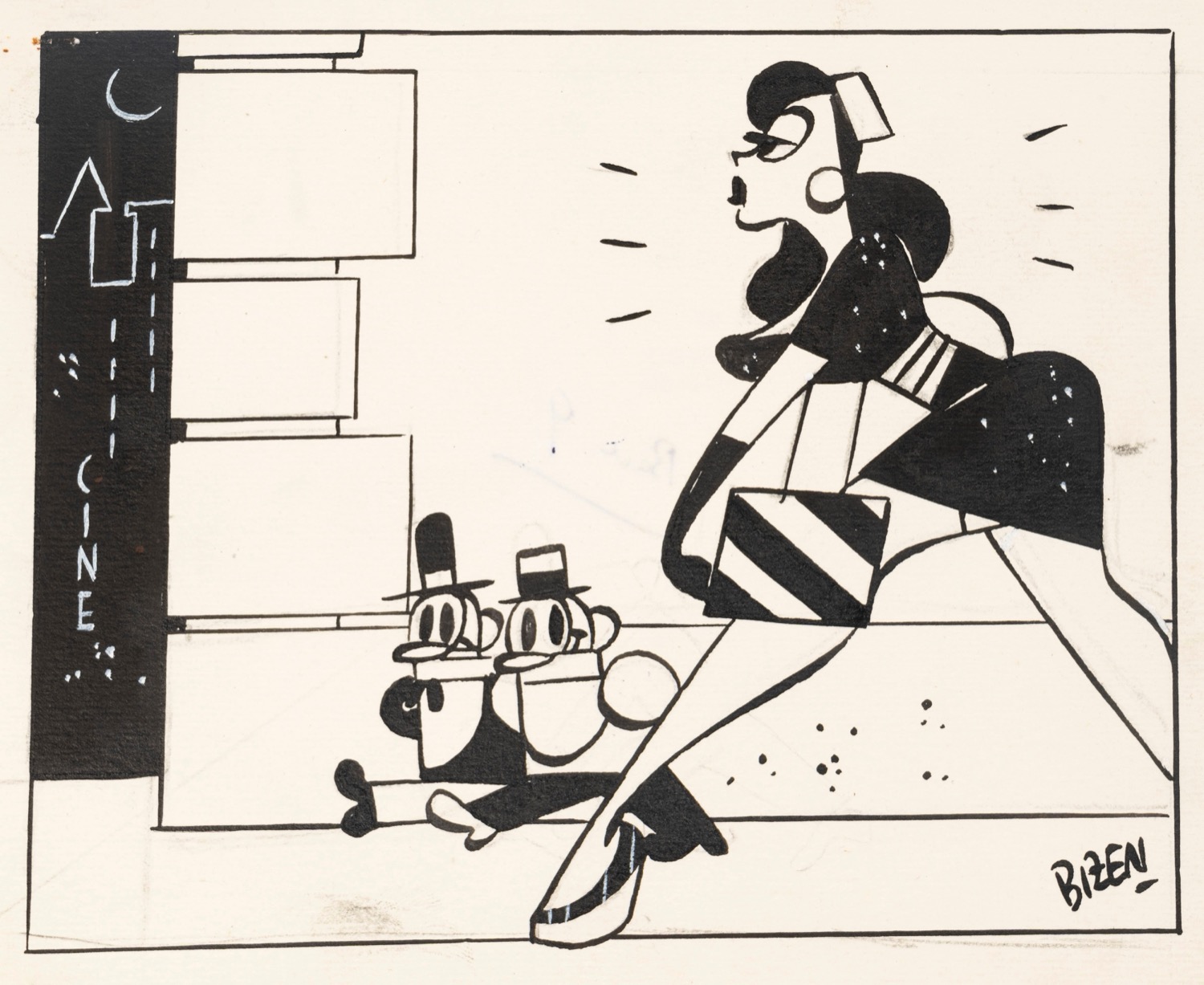 Coppia di 2 vignette originali realizzate da Bizen durante gli anni '40. Fori di affissione agli angoli superiori sinistri. Entrambe firmate.