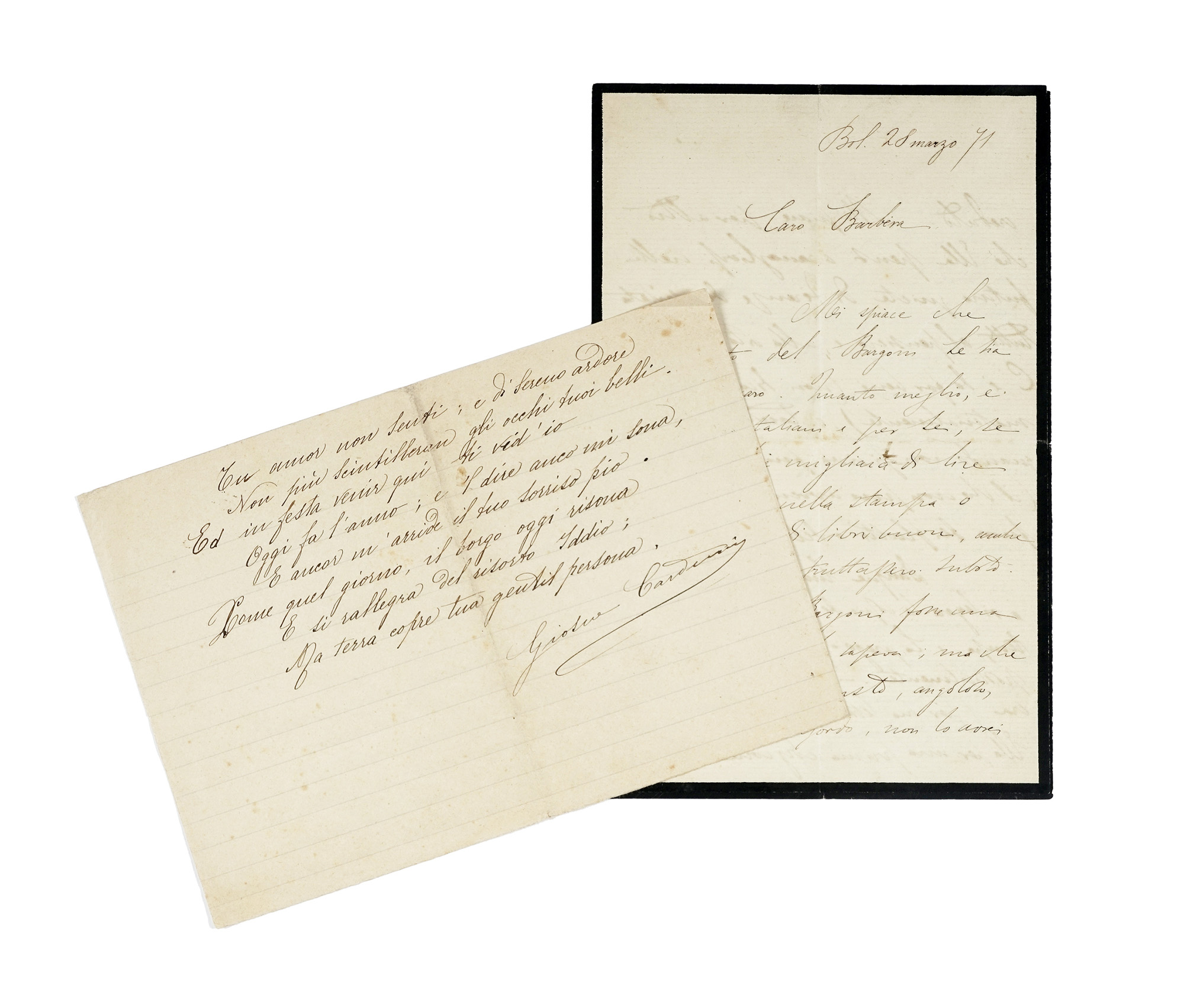 Carducci Giosuè, 2 sonetti autografi firmati e 1 lettera autografa inviata a Barbera. Lettera datata 28 marzo 1871, Bologna.