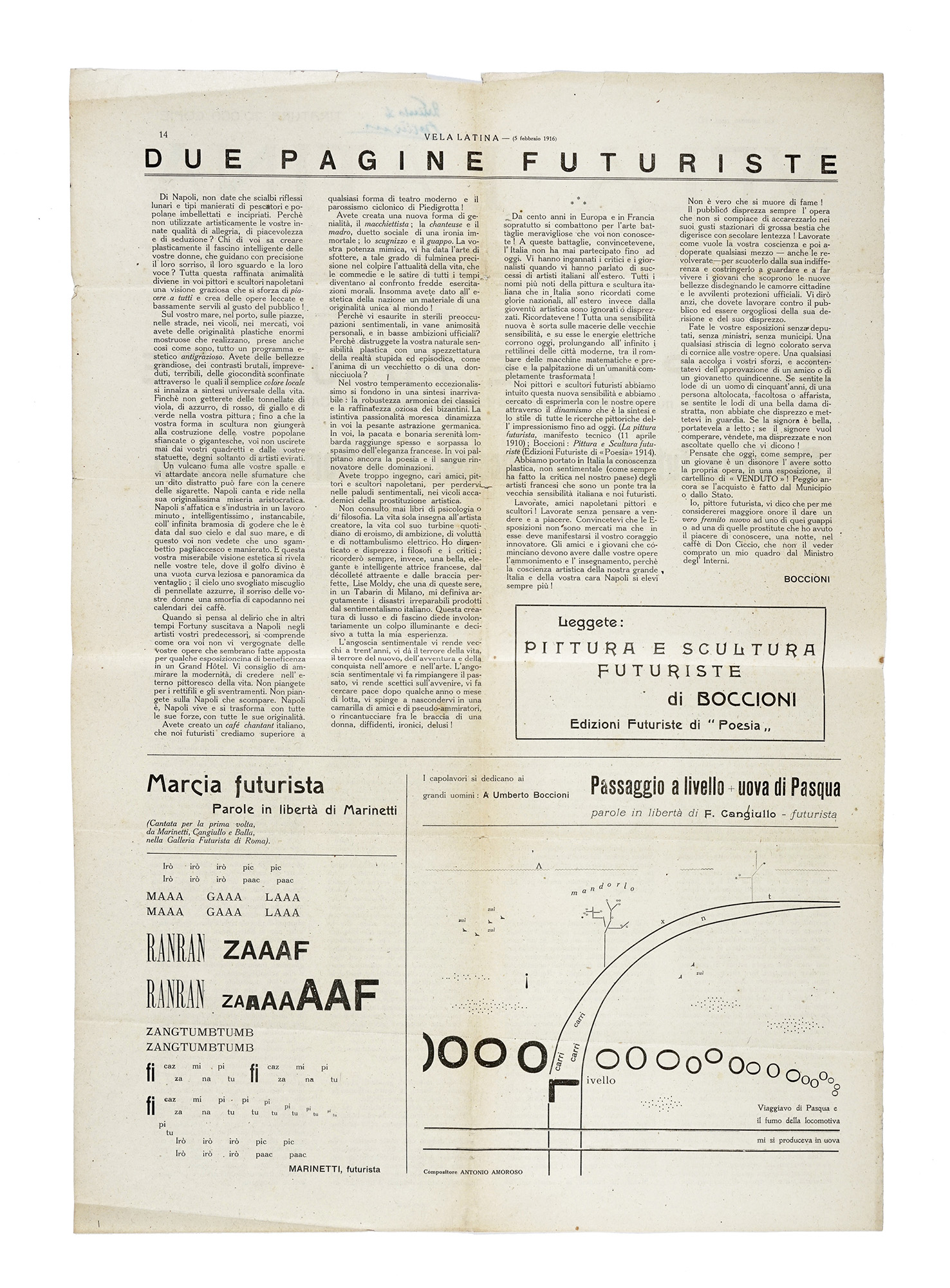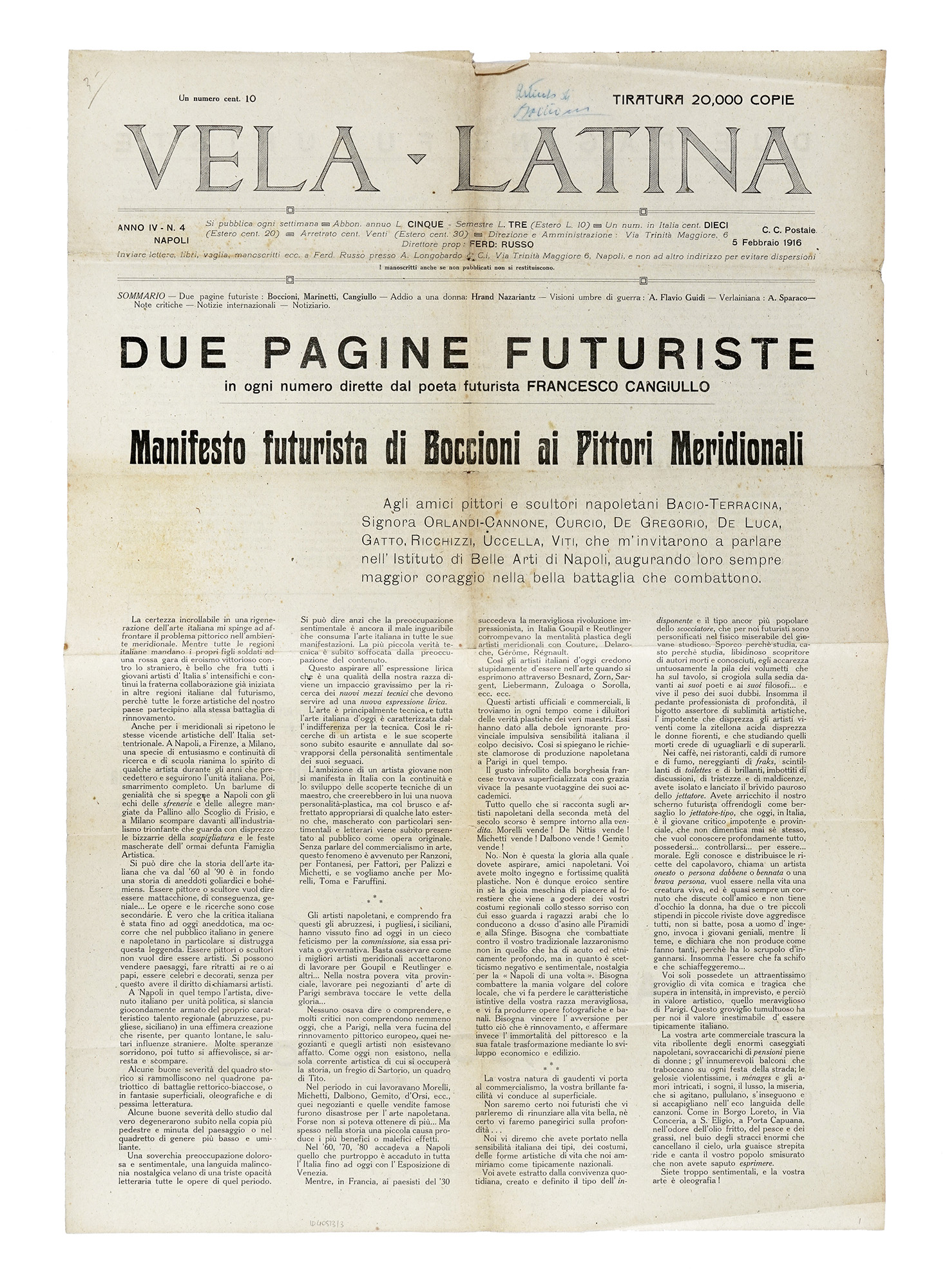 Boccioni Umberto, Vela Latina. Manifesto di Boccioni ai pittori meridionali. (Anno IV, n. 4). Napoli: Vela Latina, 5 febbraio 1916.