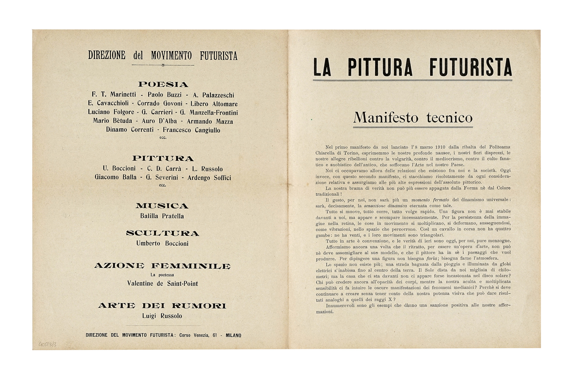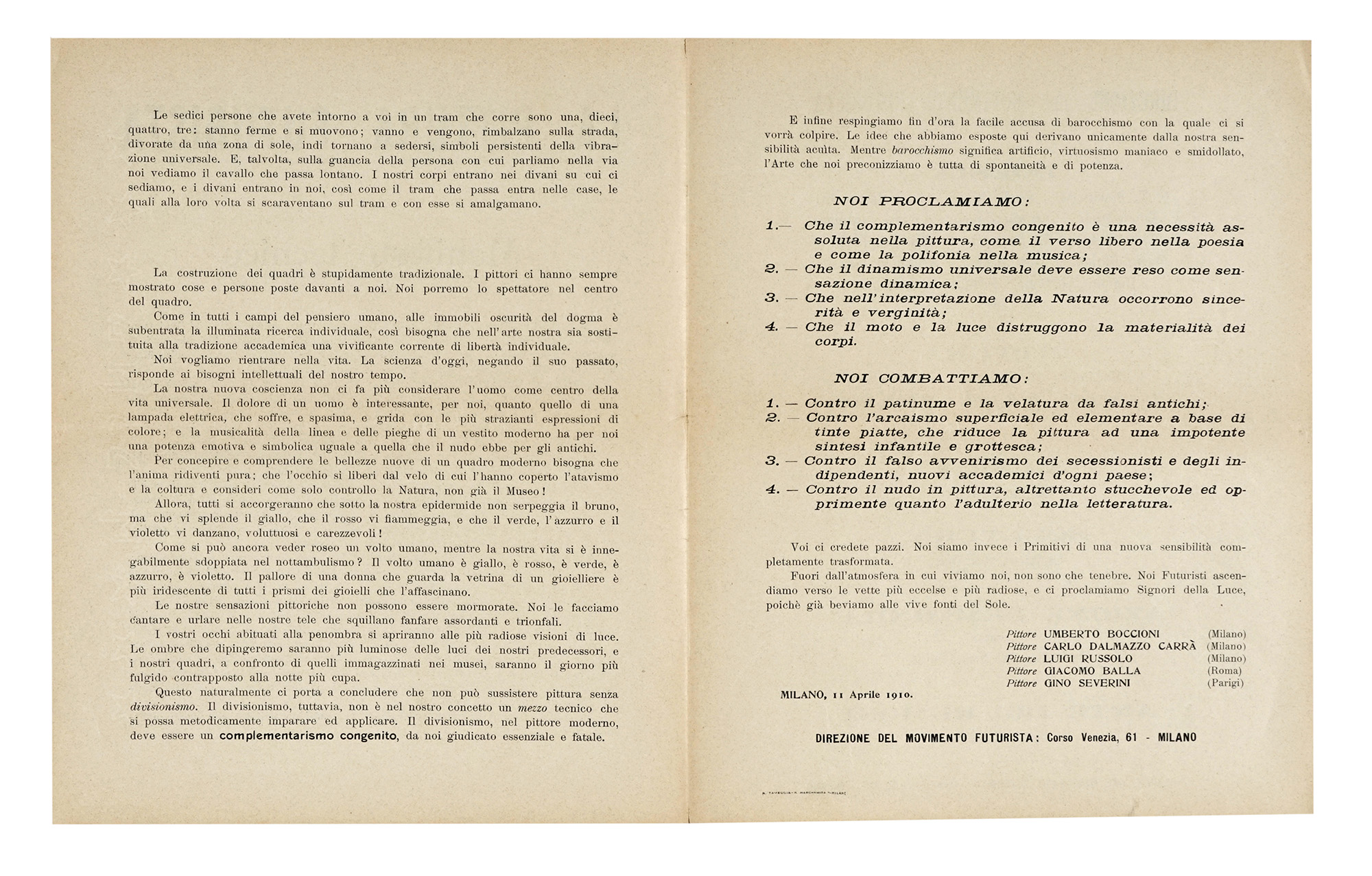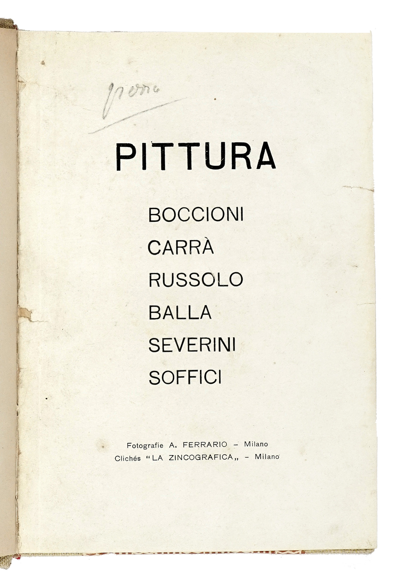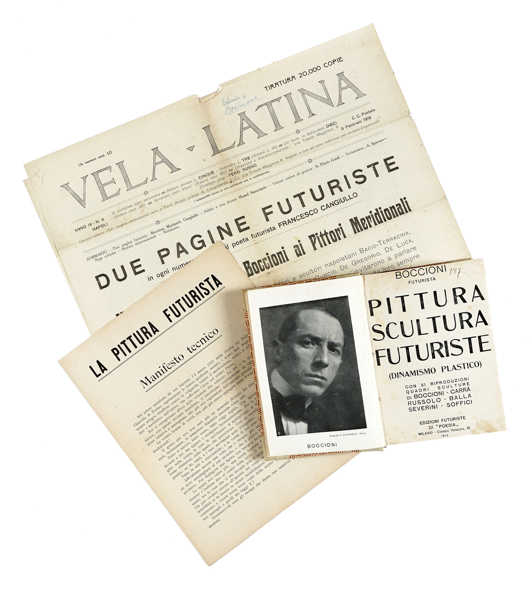 In-folio (mm 628x 436). Carta [1] stampata recto-verso. Esemplare fiorito, con strappetti marginali e lievi bruniture ai punti di antica piegatura. Annotazione manoscritta al recto e due splendide parole in libertà di Marinetti e Cangiullo al verso. SI AGGIUNGE: Id., Pittura scultura futuriste (dinamismo plastico) con 51 riproduzioni, quadri, sculture di Boccioni, Carrà, Russolo, Balla, Severini, Soffici. Milano: Edizioni Futuriste di Poesia, 1914. In-16° (mm 186x135). Pagine [8], 469, [3] (di 5) con 1 ritratto fotografico di Boccioni in antiporta e 6 (di 51) riproduzioni in bianco e nero di quadri e sculture su carta patinata. Rinforzi marginali all'occhietto, al ritratto e alle pagg. da 465 in poi; maldestri restauri ad alcune carte. Esemplare rifilato, con fioriture sparse. Mancanti 45 (di 51) tavole in bianco e nero fuori testo. Legatura successiva in mezza tela, con titoli in oro su tassello al dorso e sguardie rinnovate; entro cofanetto in cartonato, con la scritta Boccioni applicata al dorso. Ex-libris cartaceo al contropiatto anteriore e al recto del ritratto dell'Autore. Dedica autografa di Umberto Boccioni. Esemplare da studio. SI AGGIUNGE: Id., La pittura futurista. Manifesto tecnico. Milano: Poligrafia italiana, 11 aprile 1910. In-4° (mm 290x230). Carte [2]. Segno centrale di precedente piegatura e lievissimi strappetti marginali, altrimenti ottima conservazione. (3) I OPERA: Rara edizione originale di quest'opera che riflette su pregi e difetti della meridionalità italiana, soffermandosi sulla situazione artistica napoletana, che prende le mosse dalla conferenza tenuta da Boccioni il 16 gennaio 1916, nella quale furono coinvolti un ampio numero di artisti napoletani non direttamente legati al futurismo. Tra questi, il paesaggista Giuseppe Casciaro che fece stampare e diffondere assieme a Francesco Cangiullo una cartolina di invito a leggere il manifesto pubblicato su Vela latina. Con due splendide parolibere di Marinetti e Cangiullo al verso. II OPERA: Prima edizione di questo fondamentale trattato sulla pittura futurista, lo scritto più importante di Boccioni, corredato da un imponente apparato iconografico (qui in gran parte assente) e impreziosito dalla dedica autografa dell'Autore. Cfr. Cammarota 40.1; Salaris 23b. III OPERA: Echaurren Pablo, Futurismo. Collaudo 1909-2009 (catalogo di vendita). Milano: Libreria Antiquaria Pontremoli, 2009, 12: «Seconda edizione, firmata dal quintetto definitivo dei pittori futuristi (Boccioni, Carrà, Russolo, Balla e Severini). Il manifesto si conclude a p. [3], mentre in ultima pagina compare l'organigramma della Direzione del Movimento Futurista, suddiviso nelle sezioni di Poesia, Pittura, Musica, Scultura, Azione Femminile, Arte dei Rumori». La reale data di pubblicazione non è l'11 aprile del 1910 ma la fine del 1911 o l'inizio del 1912, come risulta evidente dall'indirizzo della sede del Movimento Futurista, spostatosi da Via Senato 2 a Corso Venezia 61.