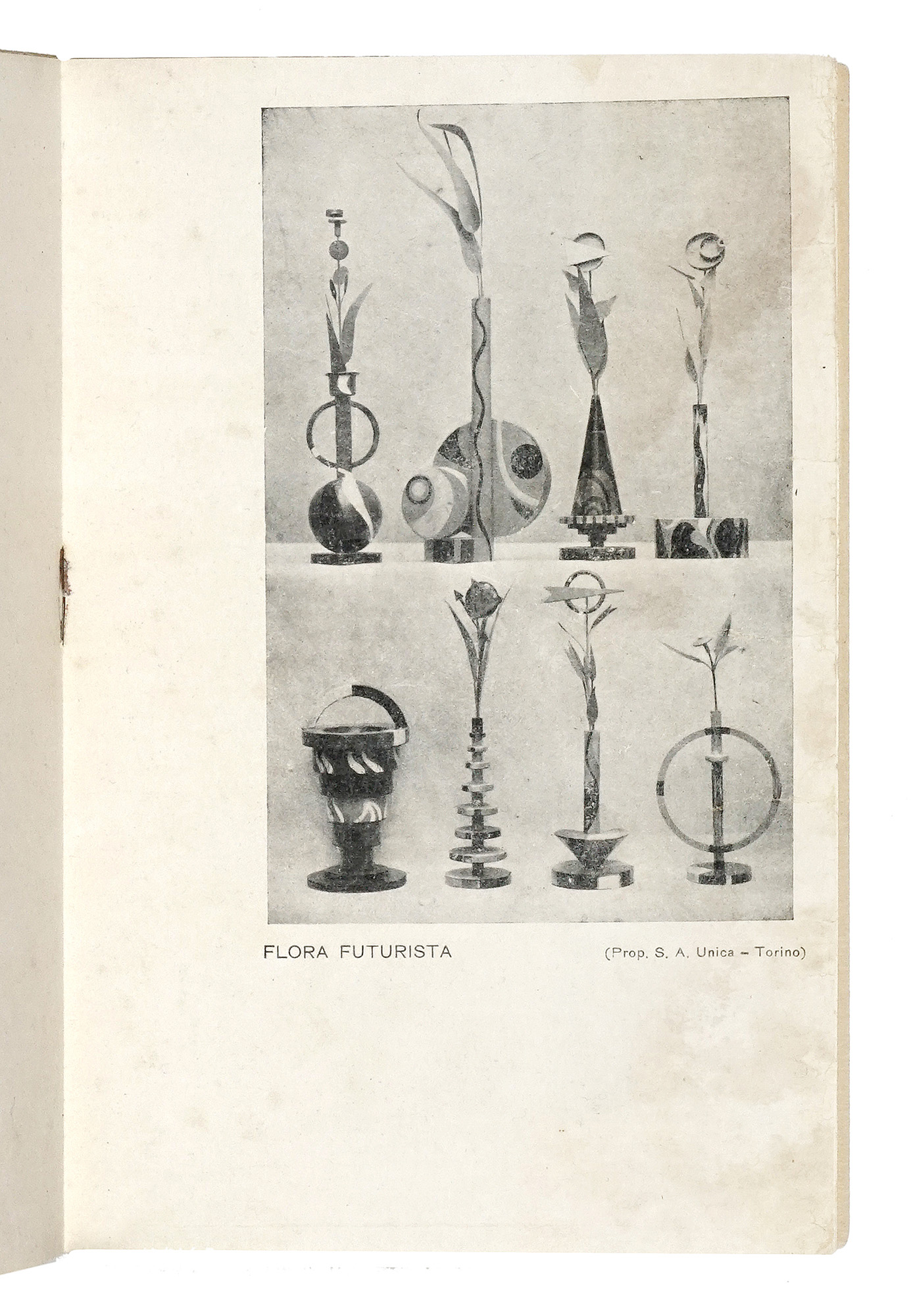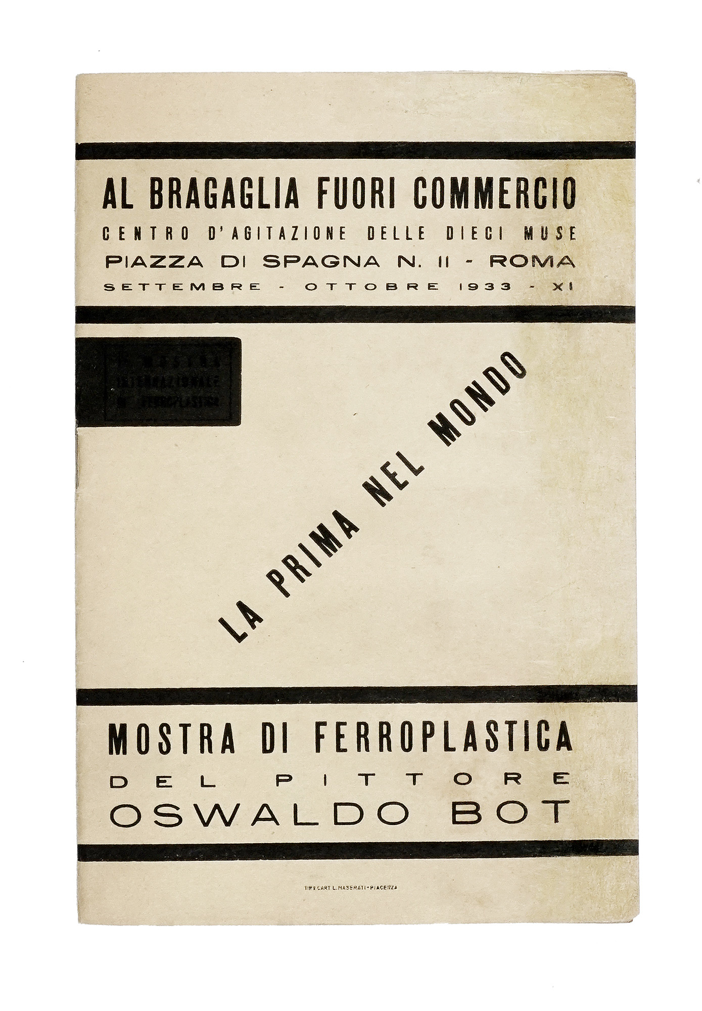 In-8° (mm 220x146). Carte [10]. Con le riproduzioni delle opere di Bot in bianco e nero nel testo, tra cui Flora Futurista, Enrica Futurista, Coppa d'acciaio ed altre. Opera completamente restaurata e controfondata con carta di riso (piatti della brossura inclusi), con rare mancanze marginali reintegrate, ma senza perdite di inciso; lievi e diffuse fioriture e aloni. Brossura originale con titoli in nero al piatto anteriore, protetta da velina. (1) Rarissima placchetta della prima Mostra Internazionale di Ferroplastica di Osvaldo Barbieri, in arte Oswaldo Bot, uno dei protagonisti più affascinanti ed eclettici del Futurismo, che diede vita a un'intensissima attività artistica di piccole edizioni introvabili e scarsamente documentate.