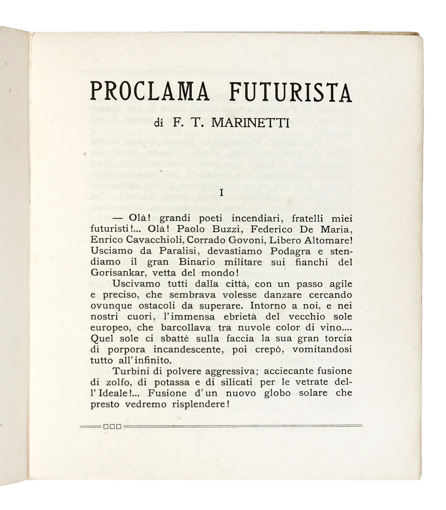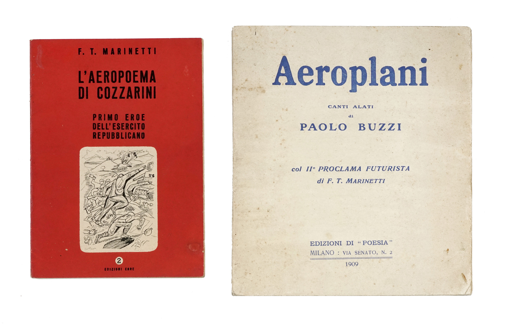 In-8° (mm 187x165). Pagine 249, [7]. Copia parzialmente intonsa e ben conservata, con lievi e diffuse fioriture e alcune leggere e uniformi arrossature concentrate principalmente alle ultime pagine. Brossura editoriale con titoli in blu al piatto anteriore e al dorso, con marchio "Poesia Rassegna Internazionale" al piatto posteriore. Leggere fioriture e qualche segno del tempo alle cerniere e al dorso, ma nel complesso buona conservazione. Con la dedica autografa di Buzzi a Cosimo Giorgieri Contri, poeta, scrittore e drammaturgo italiano, alla prima carta bianca. SI AGGIUNGE: Marinetti Filippo Tommaso, L'aeropoema di Cozzarini. Primo eroe dell'esercito repubblicano. S.l. [i.e. Milano]: Edizioni Erre, s.d. [i.e. 10 maggio 1944]. Brossura editoriale rossa con titoli in nero, illustrata con un disegno di Gino Boccasile. (2) I OPERA: Edizione originale, non comune, di questo esordio poetico di Paolo Buzzi, introdotto da una lunga prefazione di Marinetti, ben 24 pagine di energia pura, che si conclude con l'invocazione «Tutto il nostro sangue, a fiotti, per ricolorare le aurore ammantate della Terra! ... Sì, noi sapremo riscaldarti tra le nostre braccia fumanti, o misero Sole, decrepito e freddoloso, che tremi sulla cima del Gorisankar!». II OPERA: Prima edizione in volume, con testo precedentemente pubblicato su Orizzonte e Italia Nuova.