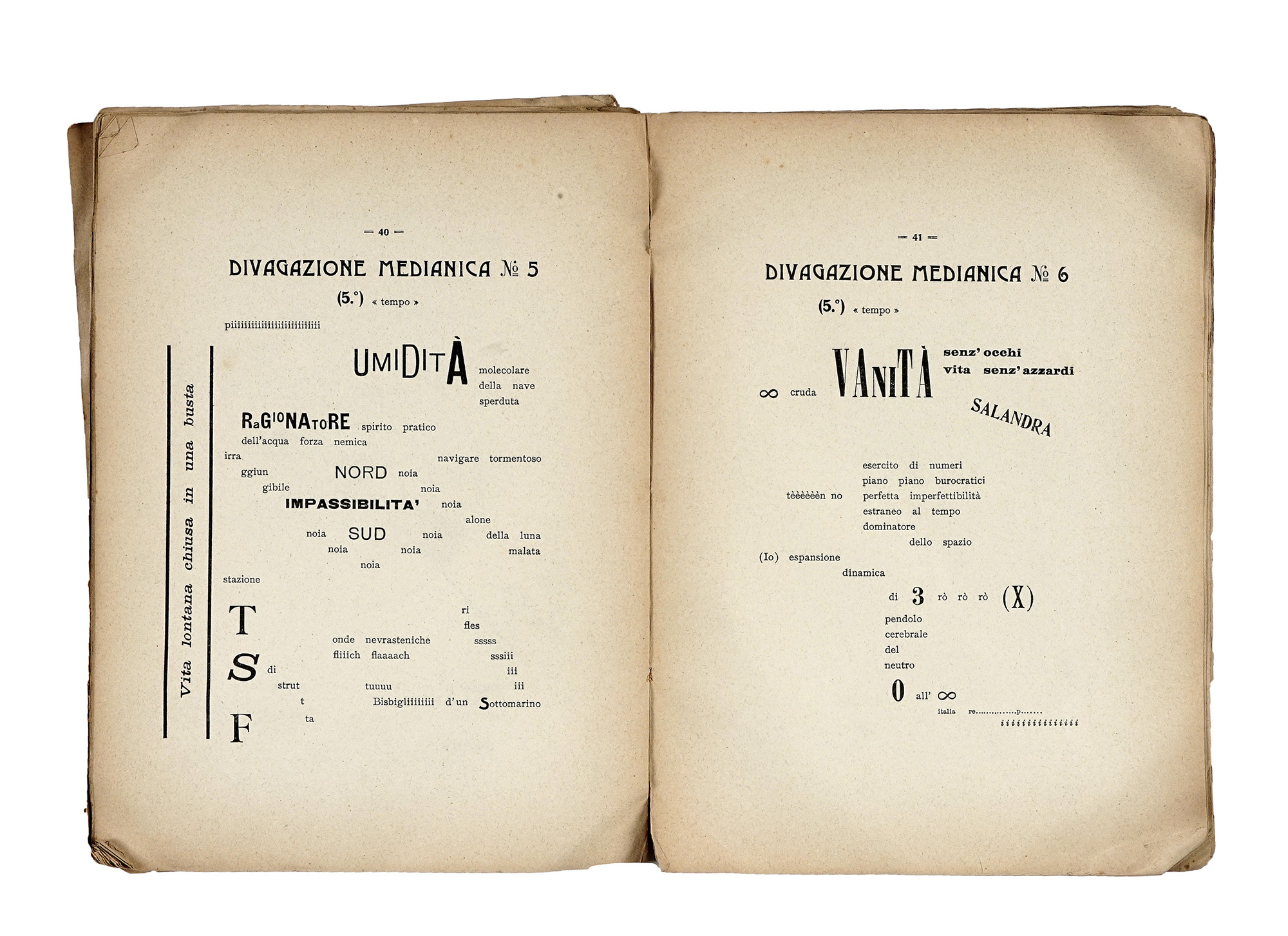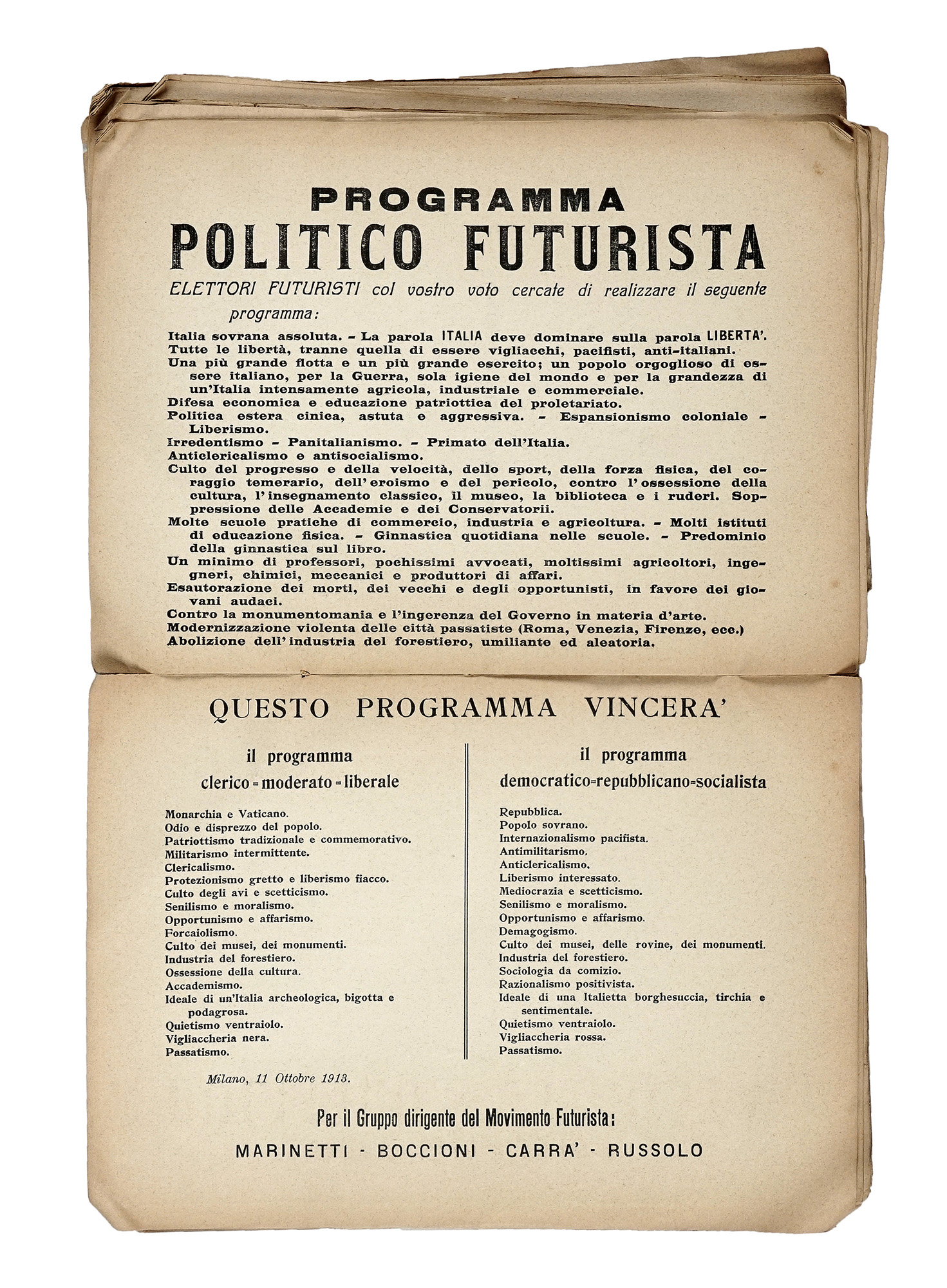 In-8° (mm 260x190). Con 1 ritratto fotografico dell'Autore di Nunes-Vais, 12 tavole di Disegni Guerreschi, di cui una ripiegata, 2 tavole ripiegate in fine (riproduzione del Programma politico futurista, 1913; riproduzione della Sintesi futurista della guerra, 1914). Il tutto in bianco e nero, fuori testo. Numerose composizioni parolibere nel testo. Brossura editoriale, con dorso assente, fioriture e tracce marginali di carta velina ai piatti. Esemplare completamente sfascicolato, con le prime tavole slegate. Internamente in buona conservazione, salvo qualche piega e rare fioriture marginali. Copia da studio, non passibile di restituzione. Menzione fittizia del migliaio al piatto posteriore. Annotazione manoscritta Vieri Nannetti al foglio di guardia anteriore. (1) Prima edizione del testo fondamentale dell'interventismo e della teoria dell'arte futurista, con la riproduzione del manifesto Programma politico futurista del 1913, del manifesto Sintesi futurista della guerra del 1914 (seconda tiratura, edizione definitiva) e con numerose composizioni parolibere.
