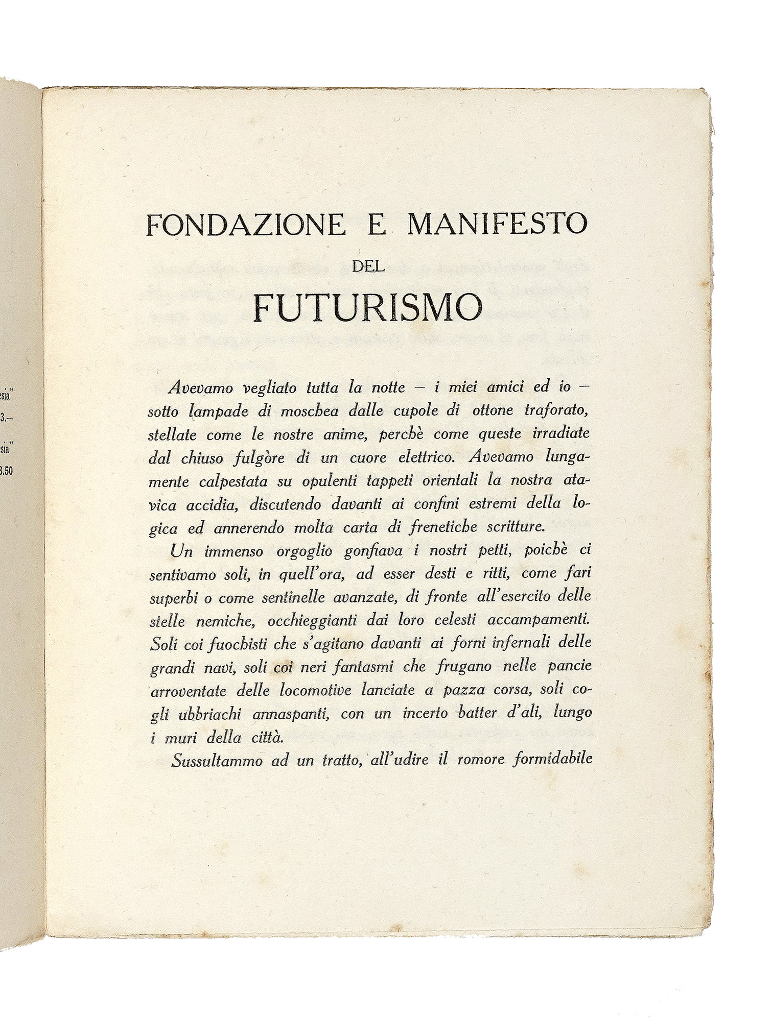 In-8° (mm 192x150). Pagine 211 (di 213), [11]. Copia in barbe, fiorita e scompleta della prima carta. Brossura editoriale arancione con titoli in grigio e una bella illustrazione di Ugo Valeri, esaltata dall'arancione di fondo, al piatto anteriore (quest'ultimo presenta fioriture). Menzione fittizia del migliaio al piatto anteriore. (1) Non comune e interessantissima raccolta di poesie versolibere, opera prima futurista nonché primo libro italiano a ospitare la prima edizione integrale in volume della Fondazione e Manifesto del futurismo di Marinetti come prefazione.