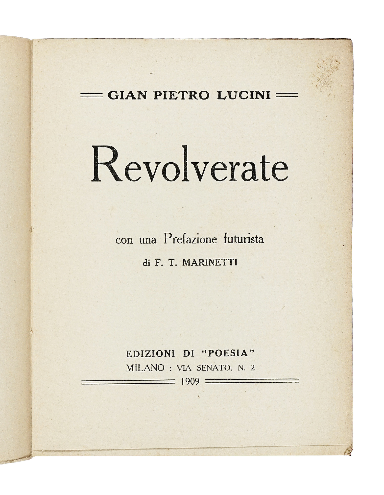 Lucini Gian Pietro, Revolverate. Con una prefazione futurista di F.T. Marinetti. Milano: Edizioni di poesia, 1909.