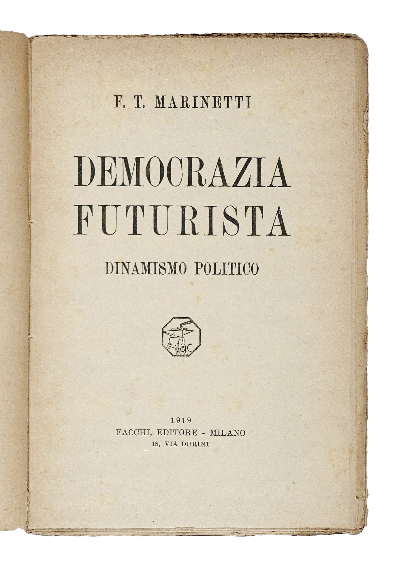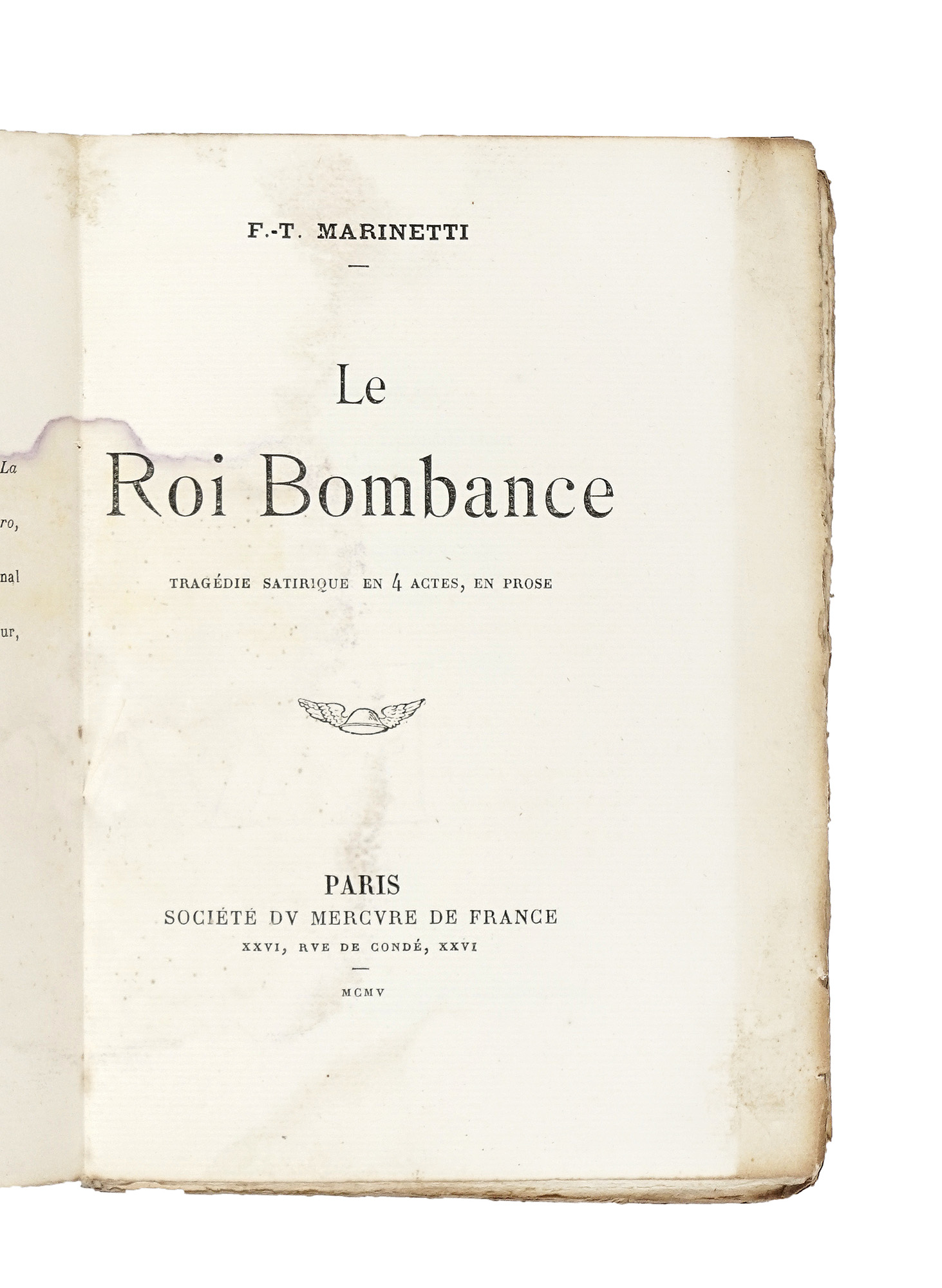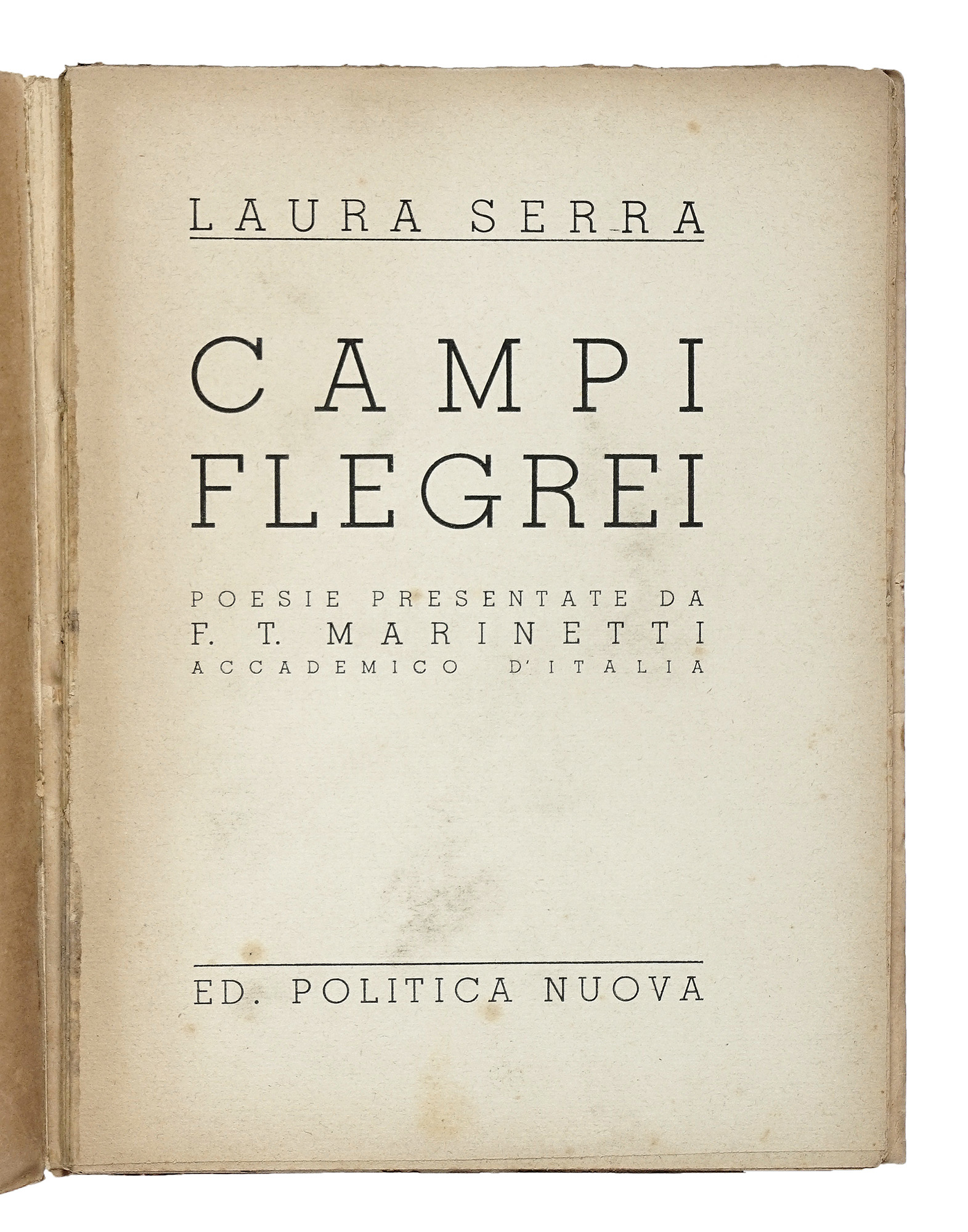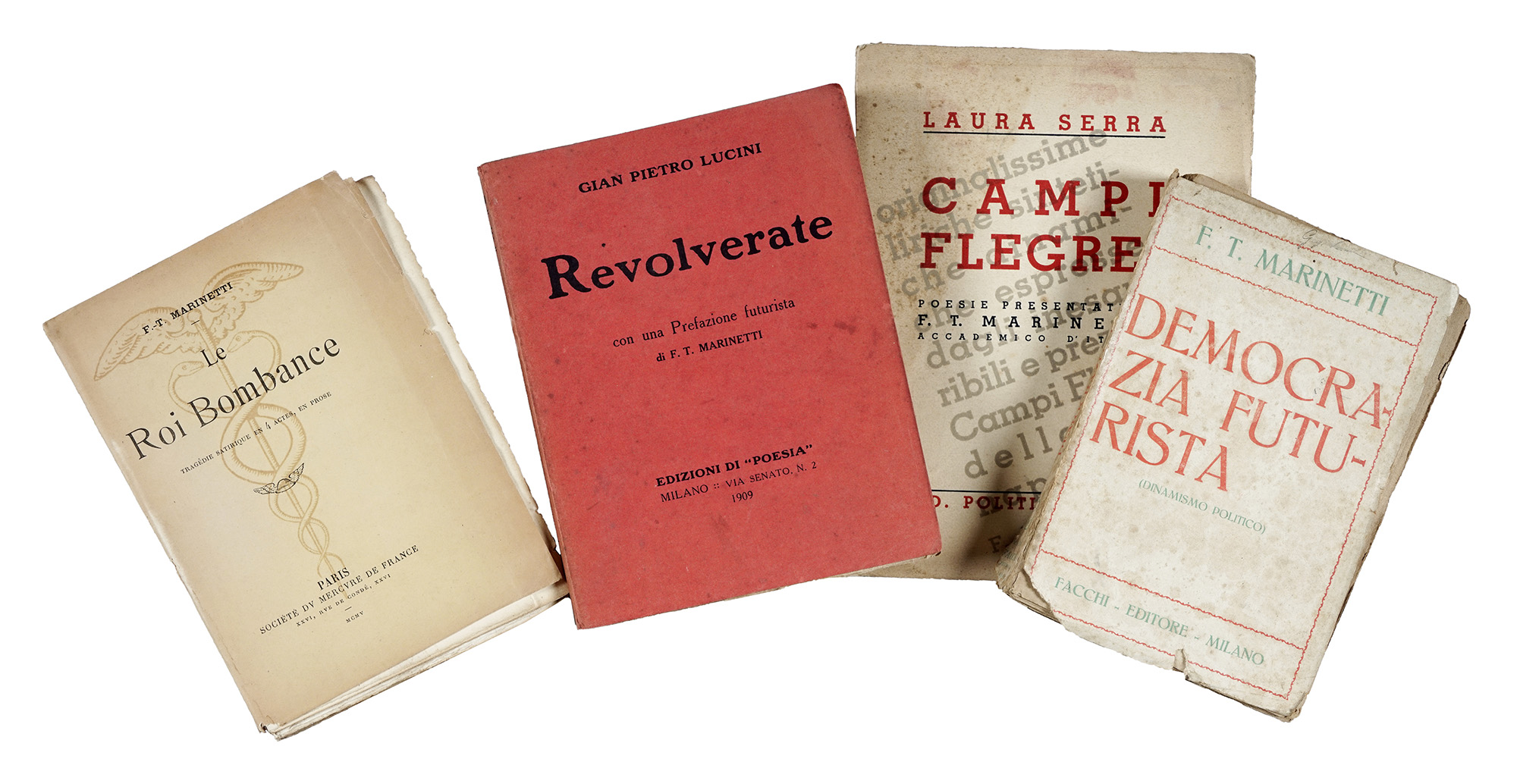 In-8° (mm 190x148). Buona copia in barbe. Brossura editoriale, con titoli in nero ai piatti e al dorso. Bruniture da esposizione al dorso, con una piccola mancanza alla cuffia inferiore e fioriture lievi ai piatti. SI AGGIUNGE: Marinetti Filippo Tommaso, Le Roi bombance. Tragédie satirique en 4 actes, en prose. Paris: Mercure de France, 1905. In-8° (mm 185x134). Esemplare in barbe, quasi del tutto sfascicolato, con ampie gore diffuse. Brossura editoriale, con illustrazione e titoli in nero al piatto anteriore e al dorso. Completamente staccata e con gravi mancanze al dorso; macchie e strappi ai piatti. Uno dei 12 esemplari su papier de Hollande. SI AGGIUNGE: Id., Democrazia futurista (Dinamismo politico). Milano: Facchi Editore, 1919. Staccato, e con mancanze marginali, il piatto anteriore della brossura editoriale. SI AGGIUNGE: Serra Laura, Campi Flegrei. Poesie presentate da F.T. Marinetti... S.l.: Edizioni di Politica Nuova, 1939. Lotto non passibile di restituzione. (4) I OPERA: Edizione originale, tirata in 1000 esemplari, di questa raccolta di poesie di Lucini. Gambetti-Vezzosi, 464: «Titolo di Marinetti, cambiato rispetto all'originario Canzoni amare. Prefazione di Filippo Tommaso Marinetti. [...] molto ricercato». II OPERA: Prima edizione del terzo libro di Marinetti, superba tragedia satirica nella quale siamo di fronte ad una metafora gastronomica rabelaisiana, ispirata anche all'«Ubu Roi» di Jarry, e filosoficamente ispirata a un pessimismo schopenhaueriano, in cui tutti i personaggi hanno nomi culinari. III OPERA: Prima edizione di questa raccolta di saggi e articoli, testimonianza del clima del primo dopoguerra.