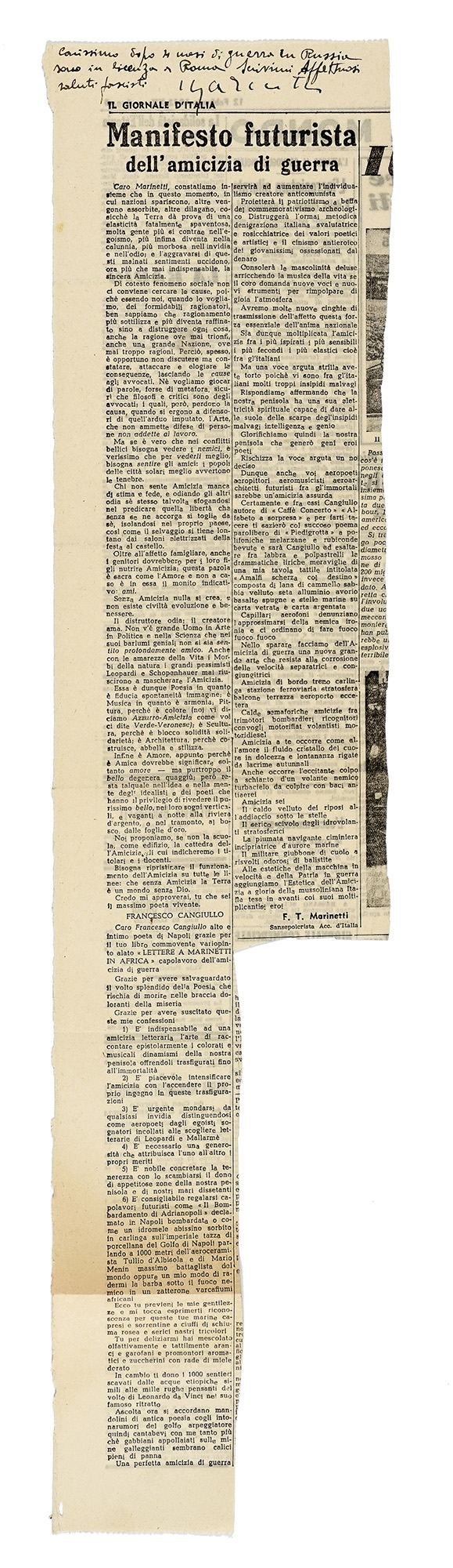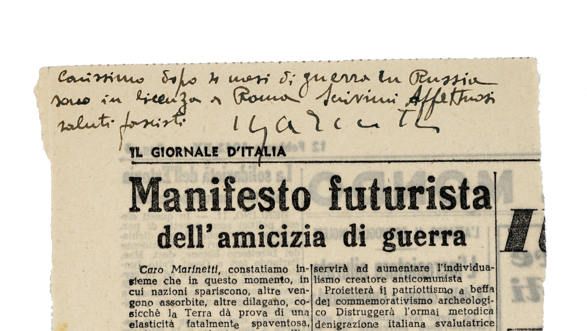 SI AGGIUNGE: Cangiullo Francesco. 1 lettera e 1 cartolina autografe firmate, inviate a Rodolfo De Angelis. La lettera è datata 1921. SI AGGIUNGE: Depliant pubblicitario relativo ad una rappresentazione futurista de Il Teatro della Sorpresa / Compagnia Futurista De Angelis [...] presso il Teatro Garibaldi di Treviso. Datato 6 dicembre 1921. SI AGGIUNGONO: Raccolta di oltre 50 articoli di giornale (ritagli) relativi a rappresentazioni futuriste e al movimento futurista. Anni '20-'50. (59) I DOCUMENTO: L'annotazione autografa di Marinetti recita: Carissimo dopo 4 mesi di guerra in Russia sono in licenza a Roma. Scrivimi. Affettuosi saluti fascisti. Marinetti. L'articolo, scritto da Marinetti e pubblicato su Il Giornale d'Italia il 12 febbraio 1942, è intitolato Manifesto futurista dell'amicizia di guerra. II DOCUMENTO: Lettera di Cangiullo a De Angelis – su carta intestata Movimento Futurista [...] - scritta da Napoli: [...] Per la Compagnia del Teatro a Sorpresa resta convenuto: Voi mi passerete una diaria di cinquanta lire al giorno, a cominciare dal debutto in Napoli, perché io sia condirettore artistico del Teatro della Sorpresa e segua la vostra Compagnia Futurista, con a capo F.T. Marinetti, nella tournée di un mese. Beninteso, viaggi di seconda classe pagati. Il pagamento della diaria mi verrà effettuato con l'anticipo di tre giorni, come agli attori. Tengo che il mio nome [...] figuri in qualsiasi affiche, programma o altra réclame. Circa i diritti d'autore sui miei lavori, come abbiamo stabilito con la Società degli Autori. Un grande augurio e: Avanti! Nella teatrale battaglia futurista! [...]. III DOCUMENTO: Il programma della serata comprendeva: F.T. Marinetti: Strabiglianti sorprese / F. Cangiullo: L'impreovvisata, Il contratto, L'occhio critico / Cangiullo e De Angelis: Consiglio di leva, Stornelli vocali, Luce! / Boccioni: Cielo e ciglia, Dimenticatore e contatore, Il bastone tra le ruote / R. Chiti: Le prugne verdi, Il corpo che sale / Parossismo. Cangiullo: Parole sul Teatro della Sopresa [...].