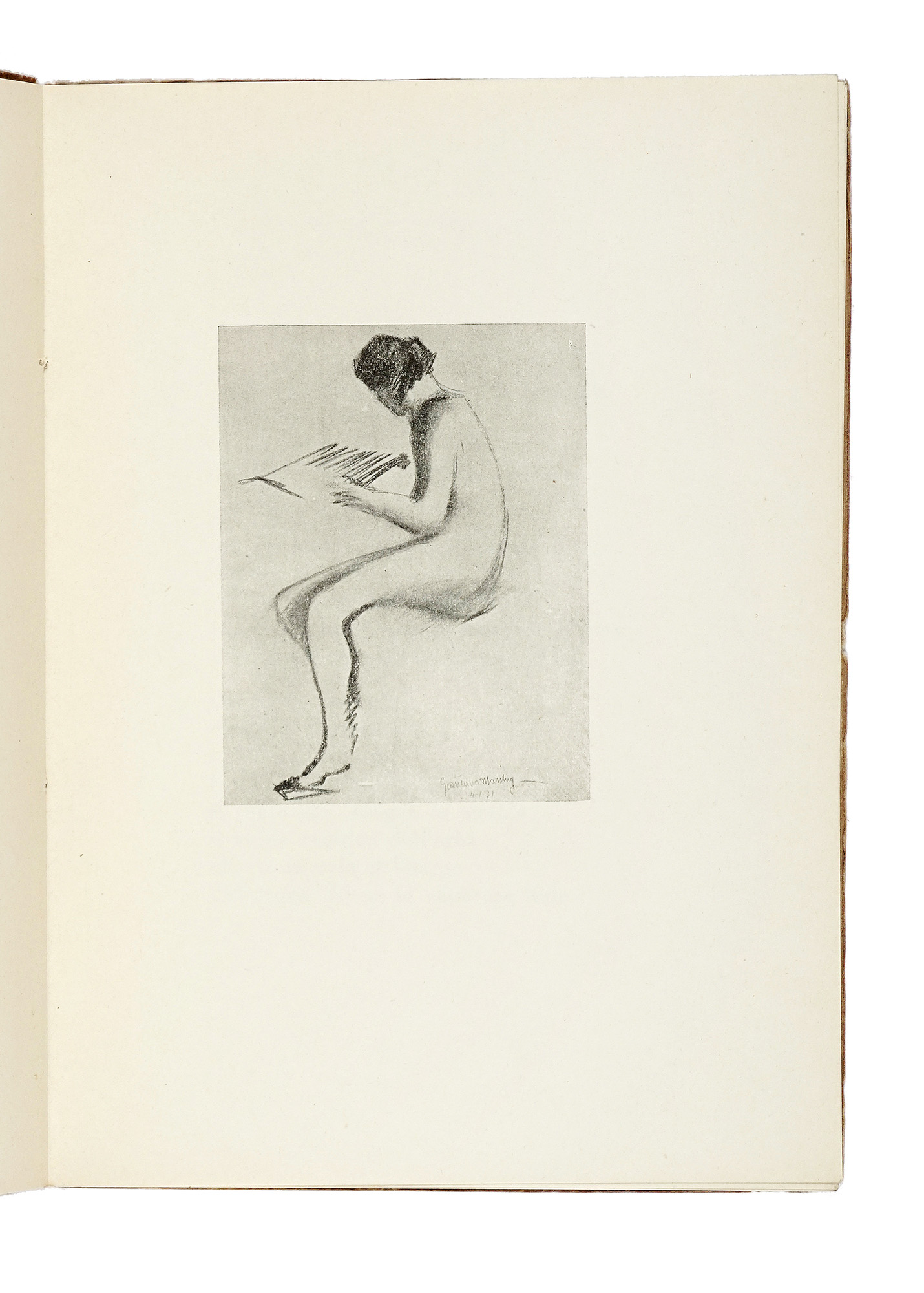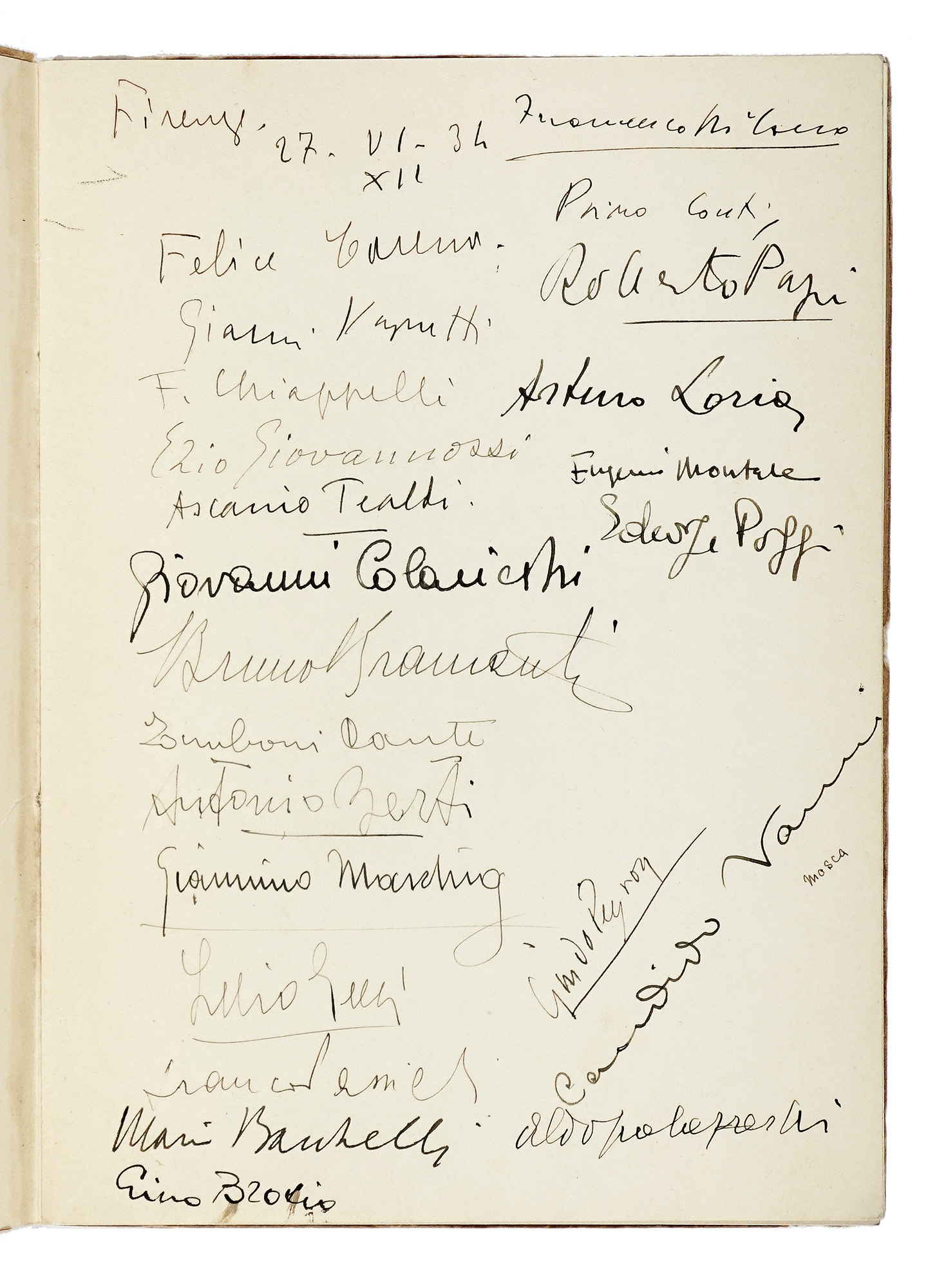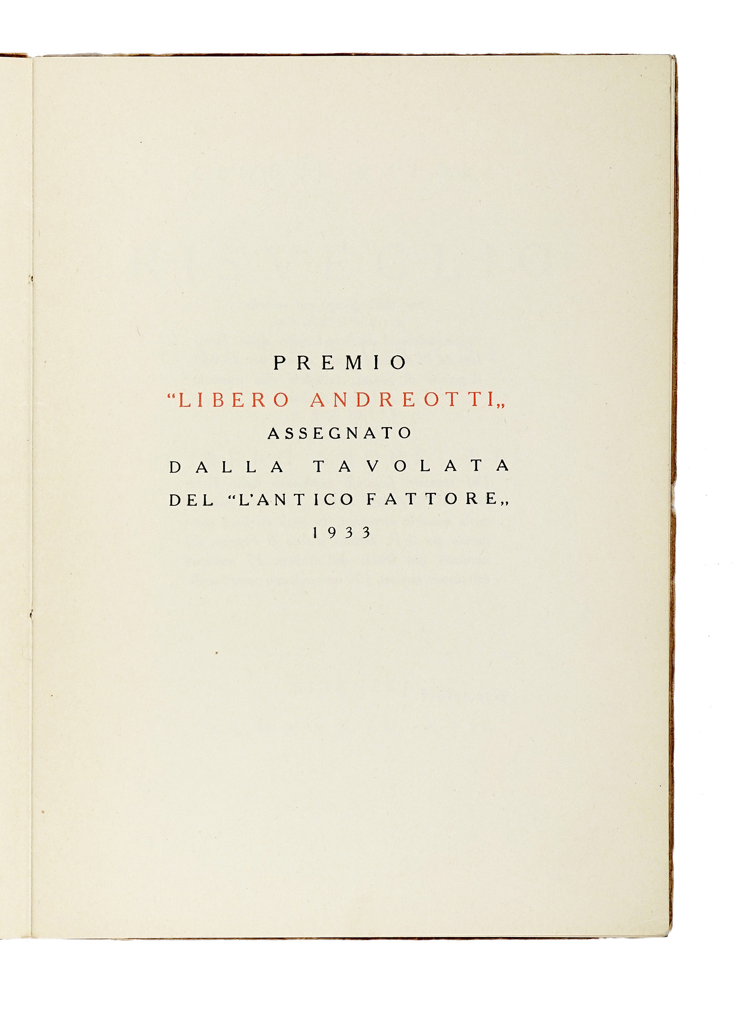 In-4° (mm 238x170). Pagine [4] bianche, 37, [3], [4] bianche. Con 8 illustrazioni in bianco e nero nel testo. Brossura editoriale illustrata e con titoli in inchiostro rosso e nero al piatto. Segni di usura alle cerniere e strappetti marginali ai piatti. Annotazioni a matita ai piatti. Esemplare recante la data Firenze, 27-VI-34 e le firme degli Artisti e degli Autori della tavolata dell'Antico Fattore. Dedica manoscritta «Alla mia gioia più vera / più intima» siglata C.V. (presumibilmente Candido Vanni, segretario storico del famoso premio letterario fiorentino) al verso della terza carta non numerata. Uno dei 25 esemplari in numeri romani, su una tiratura complessiva di 160 copie. (1) Prima edizione di questa poesia di Glauco Natòli, esimio francesista dell'università di Firenze, con le illustrazioni di Mario Bacchelli, Bruno Bramanti, Francesco Chiappelli, Lelio Gelli, Bruno Innocenti, Domenico Lazzereschi, Giannino Marchig e Guido Peyron. La placchetta è inoltre arricchita dalle firme di: Montale, Conti, Loria, Tealdi, Colacicchi, Berti, Gelli, Bramanti, Peyron, Chiappelli, Poggi e molti altri. L'opera vinse la terza edizione del Premio Antico Fattore, tenutasi nel 1933 e dedicata alla memoria di Libero Andreotti, scomparso all'inizio del '33; per questo motivo sulla placchetta, pubblicata come tradizione da Vallecchi, si legge Premio "Libero Andreotti".