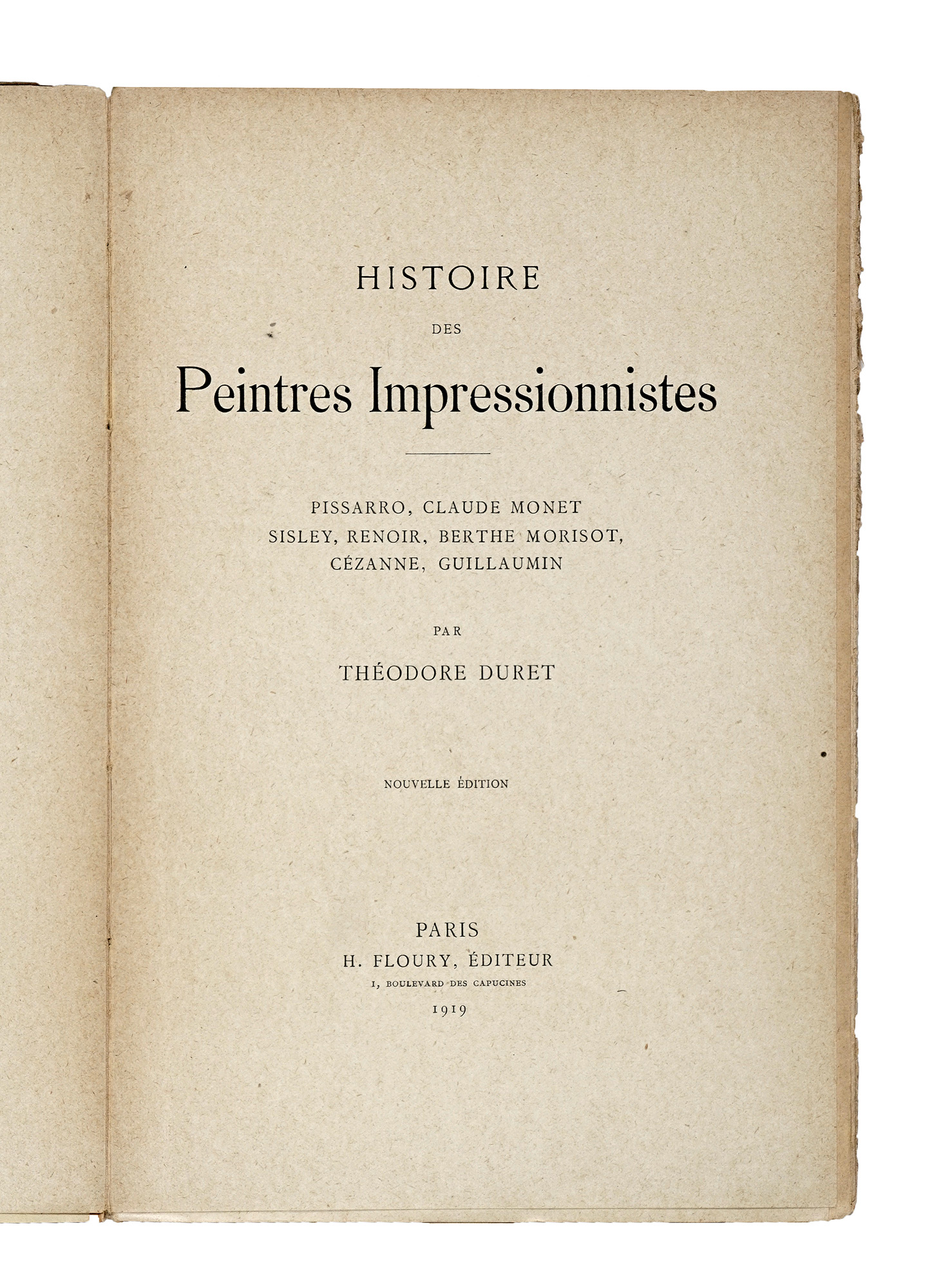Duret Théodore, Histoire des peintres impressionnistes: Pissarro, Claude Monet, Sisley, Renoir, Berthe Morisot, Cézanne, Guillaumin [...]. Nouvelle édition. Paris: H. Floury, 1919.